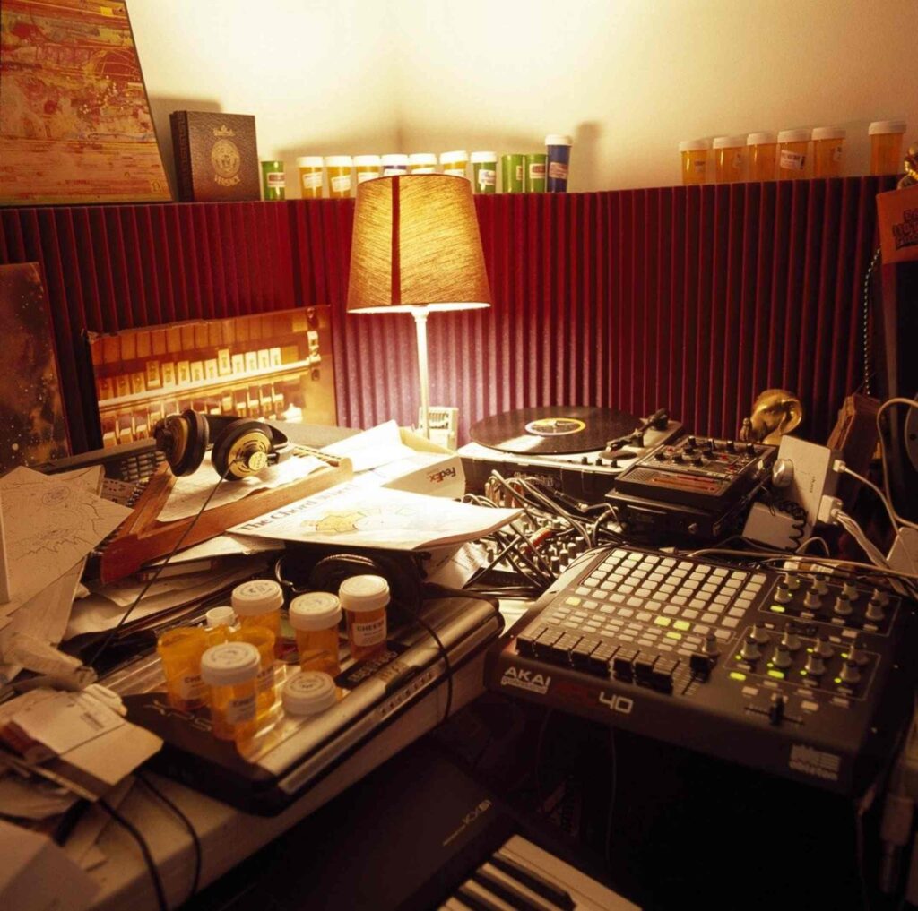 Other, more unusual, details underscore the lived reality of these spaces. El‑P’s studio floor included scattered sneakers and socks; In Muldrow’s kitchen studio, a child’s crib sits within arm’s reach of the workstation; Flying Lotus’s workspace contained medicinal marijuana containers; The Alchemist kept a prominent jar of the same stuff nearby. Rashid likes it that way, deliberately avoiding staging or rearranging anything, preferring authenticity over polish. He often tells artists not to tidy up and not to dress up, preserving the natural overlap between home life and creative labor.