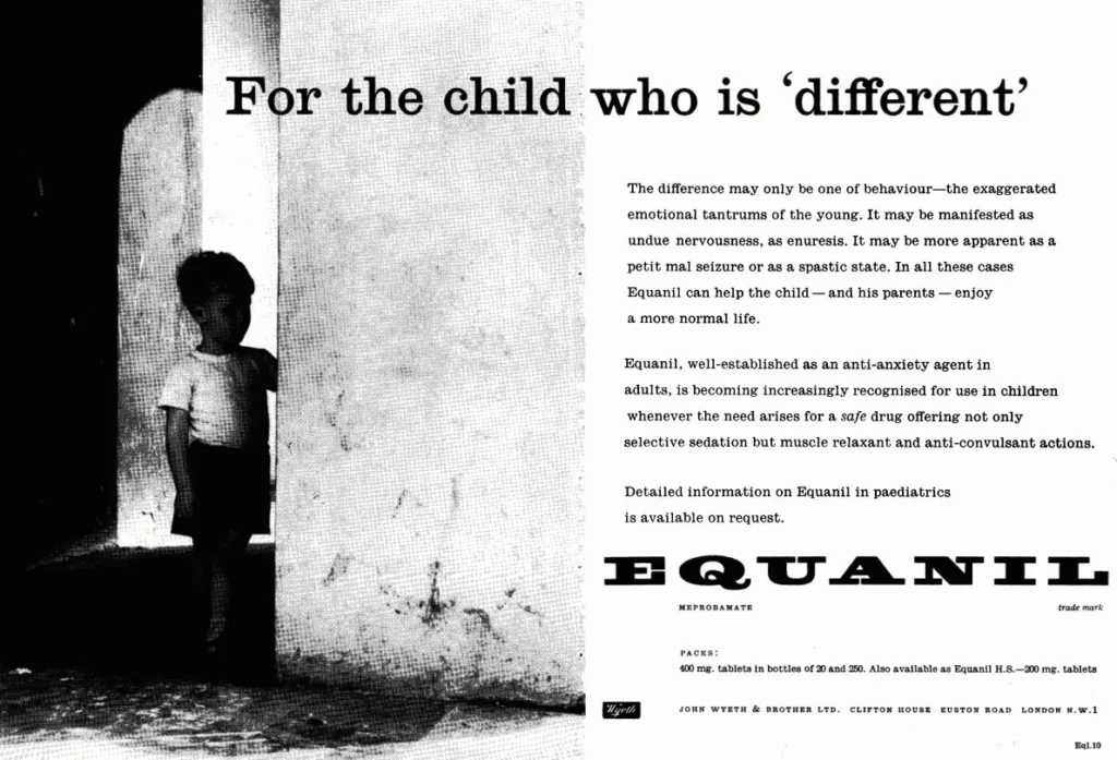 Librium and its successors extended this logic into everyday life. Anxiety, tension, and dissatisfaction, particularly among middle-class adults, were reframed as chemical imbalances requiring pharmaceutical correction. The ads often pathologized social roles: the emotionally “unstable” housewife, the “excitable” child, the overworked man, and so on. These depictions reinforced rigid norms while presenting medication as a way to return individuals to their expected function within society.