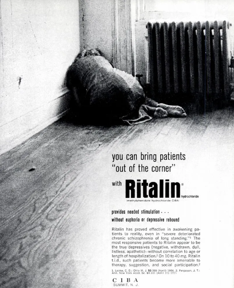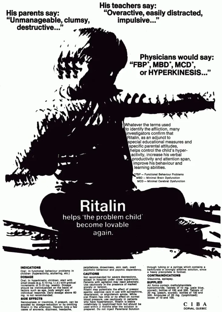Ritalin advertising was perhaps the most unsettling in retrospect. Early campaigns frequently depicted the drug as a mild aid for tired housewives before shifting towards a strong therapy for restless children, depicting them as disruptive forces and classroom problems to be chemically managed. Restlessness and disobedience were medicalized with little concern for long-term consequences, developmental nuance, or consent.