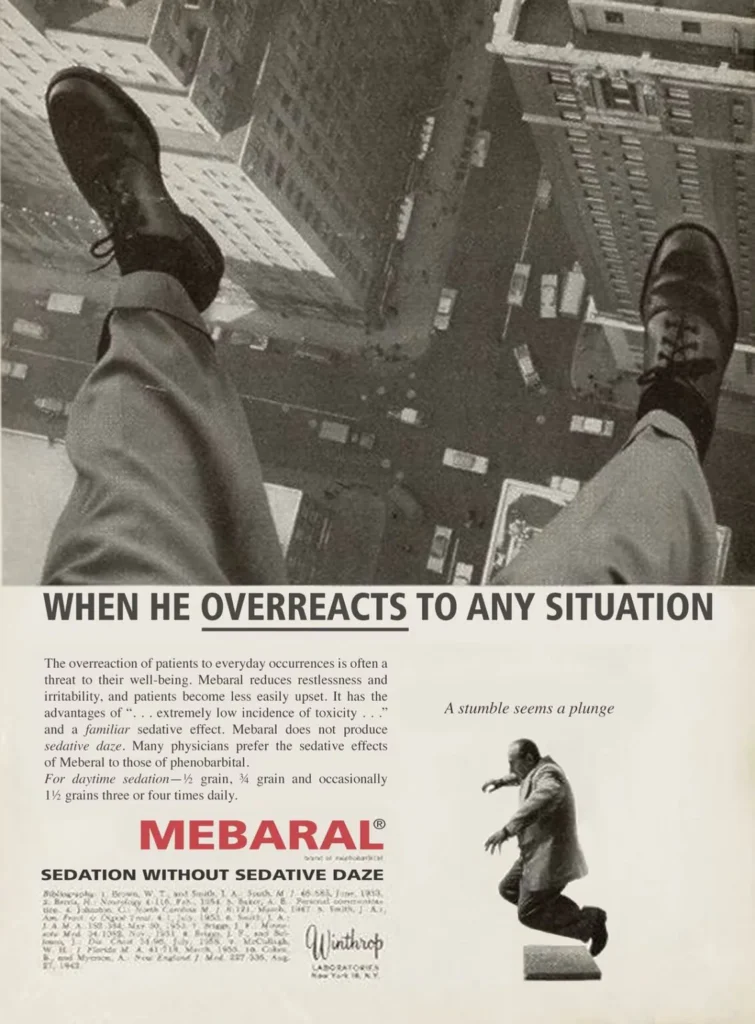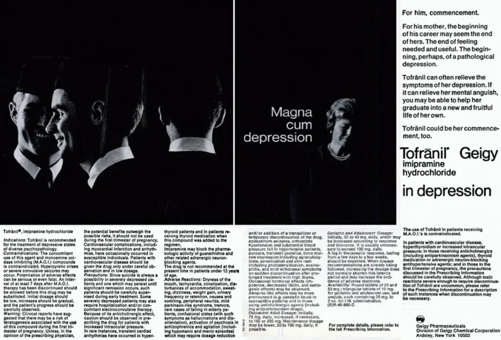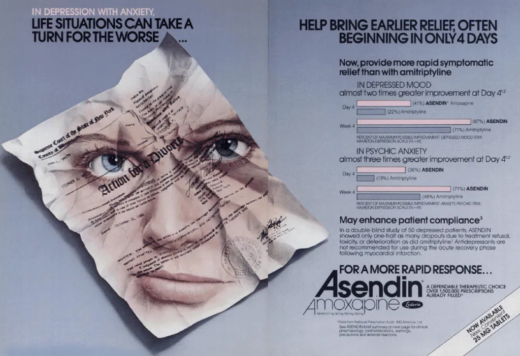Many of these examples came from an online archive of vintage advertising from the Bonkers Institute for Nearly Genuine Research, a satirical website that seemingly aims to bring to light the excesses and errors of the modern medical industry. Despite some of the innovative design, it was still not enough to keep these advertisements sustainable, and eventually the industry would begin a shift away from this aesthetic in the late 1970s that accelerated through the 1980s and 90s. Several forces converged: tighter advertising regulations, growing ethical scrutiny around psychiatric medication, the rise of consumer-directed drug marketing, and a broader cultural discomfort with stigmatizing mental illness.
