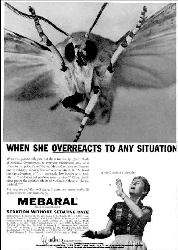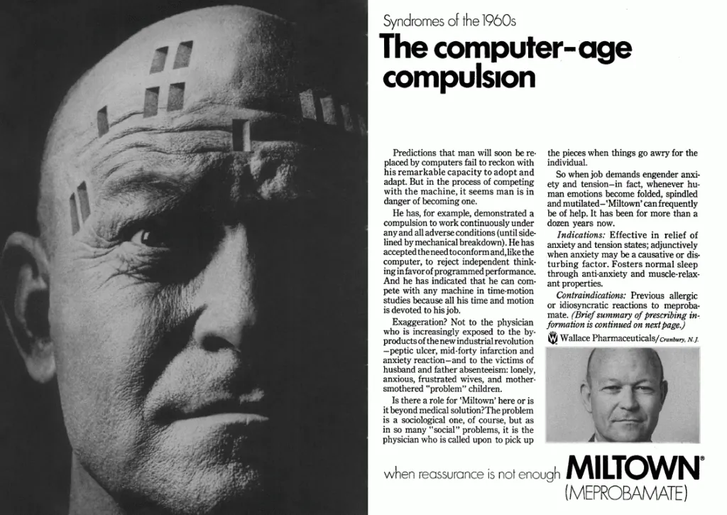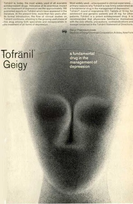 In the postwar era, pharmaceutical print advertising, especially for psychiatric drugs, was blunt, graphic, and often disturbing, using fear and medical authority to sell chemical control to doctors rather than comfort to patients. Innovative graphic design of the time often met with imagery that was anything but subdued.