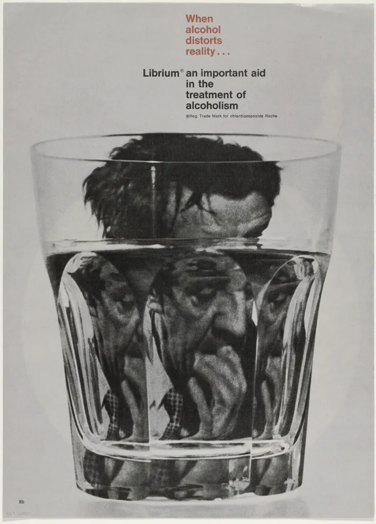 The artwork, often drawing from the same pulp traditions that horror movie posters of the time used, was graphic, moralizing, and sometimes genuinely disturbing. At the same time, innovative and forward-thinking graphic designers were usually commissioned to complete the work, resulting in visually striking design that still seems to come off as very modern, despite the contrast with the decidedly outdated contents of the ad copy itself. Rolf Harder, an important Canadian graphic designer, is one such name who had pharmaceutical clients, his work on a 1963 ad campaign for Librium, a treatment for alcohol withdrawals, being a particularly notable example of his portfolio.