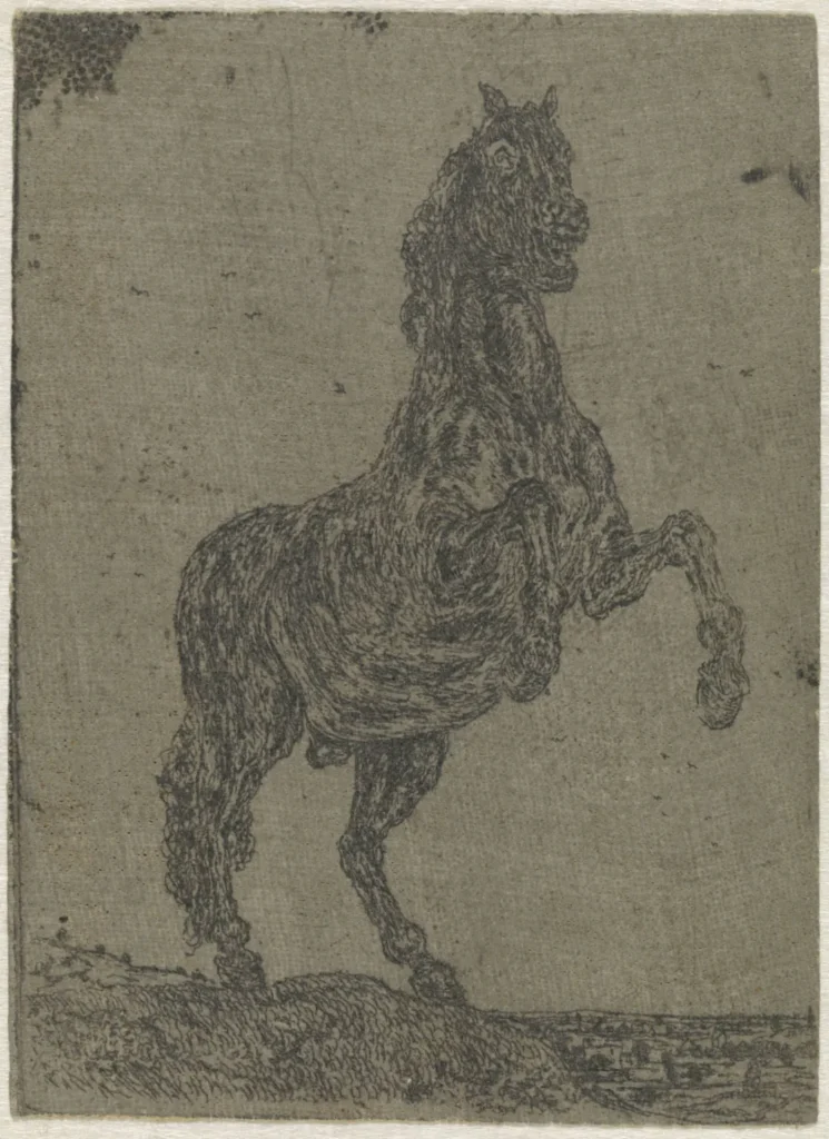 Seghers can also be credited with inventing an entirely new way to create prints. Interchangeably called the “lift-ground” or “sugar-bite” method of etching, the process allowed the artist to create a composition on the etching plate using a mixed solution of ink, cold water, and sugar instead of the traditional method of using a needle. The design would then be coated in an acid-resistant wax, and bathed in hot water before being transferred to paper in the same way as regular prints. The resulting effect appears granulated and textured using this method.