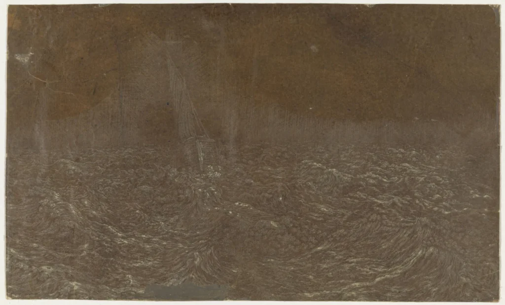 Two decades before his contemporary Rembrandt had begun using it in 1647, Seghers is known as the first European artist to have used Japanese paper and continued experimenting with other mediums to print his work on such as burlap, linen fabric from tablecloths, and even his marital bedsheets — a choice his wife was surely not happy about. Whenever he did use paper, he often colored it using his own treatments rather than using pre-colored paper which was readily available, and this sometimes resulted in his most experimental works, such as the particularly mysterious Ship in Rough Water which was printed on a dark brown background using white ink.