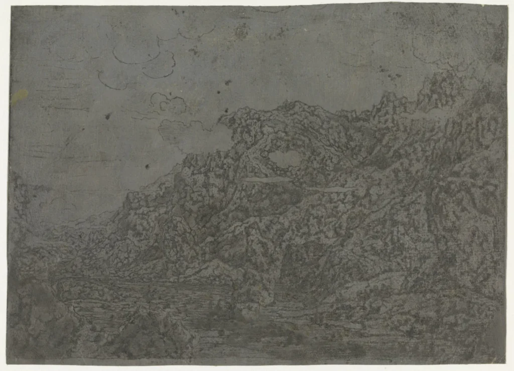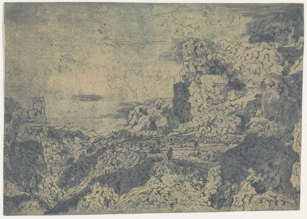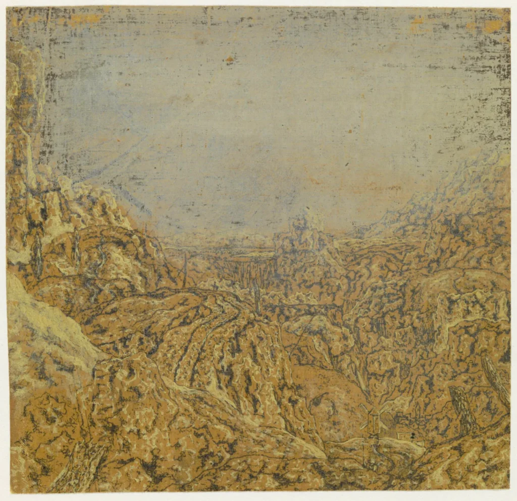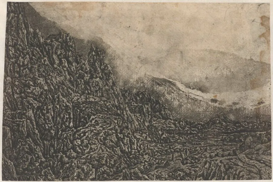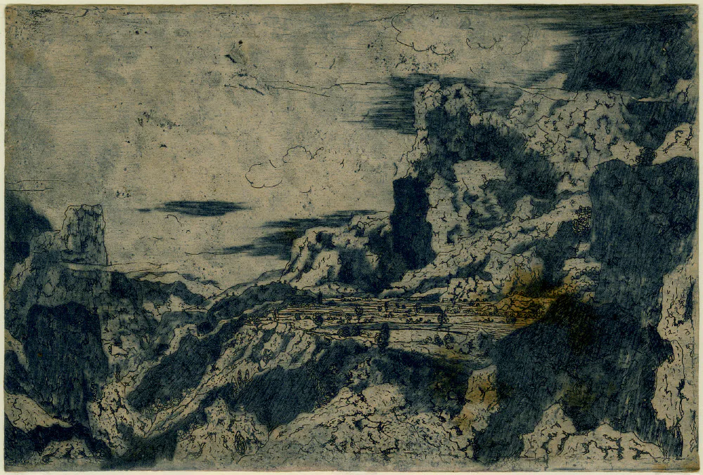 Seghers was even known to have recycled his earlier works into new prints by etching over them, visible in Rocky Landscape with a Gorge where the ghostly rigging of a ship appears in the background — a fragment of a larger, unfinished depiction of a ship that Seghers evidently abandoned — but ultimately appearing as something reminiscent of a double-exposed photograph. This innovation was surely not immediately accepted, but it did generate a wholly new visual effect.
