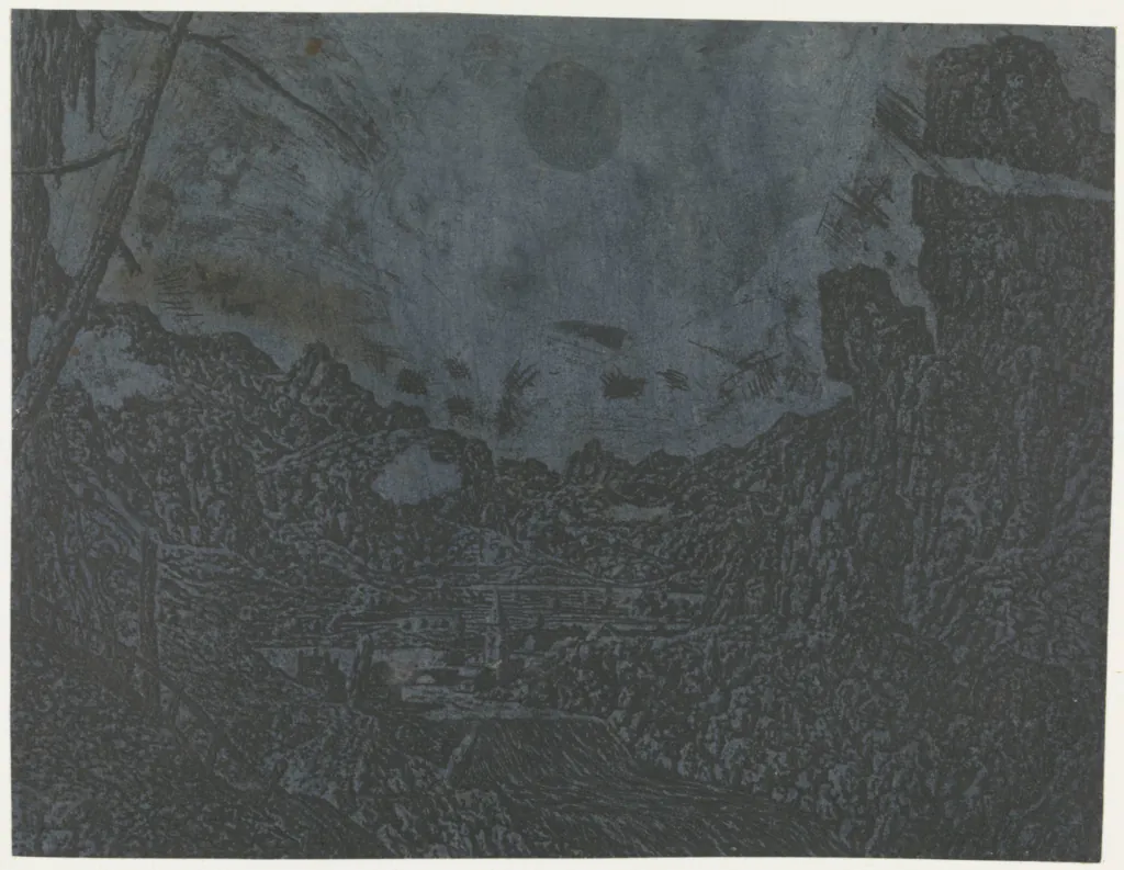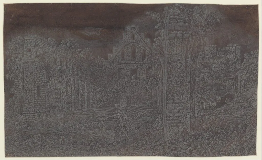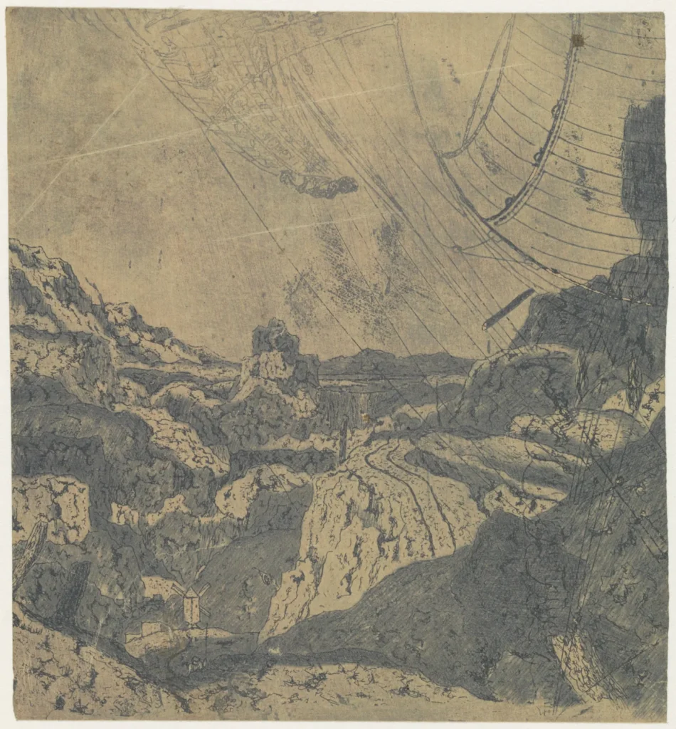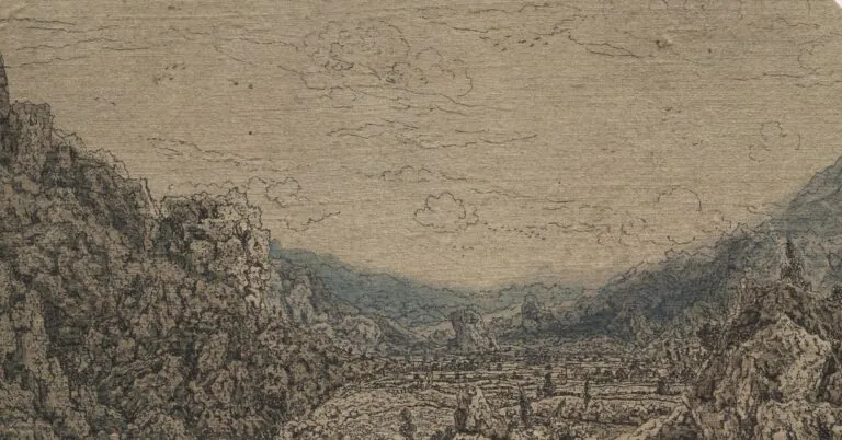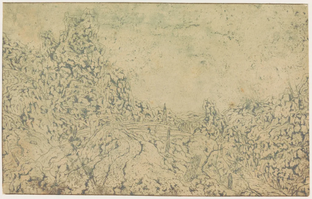 Seghers was even known to have recycled his earlier works into new prints by etching over them, visible in Rocky Landscape with a Gorge where the ghostly rigging of a ship appears in the background — a fragment of a larger, unfinished depiction of a ship that Seghers evidently abandoned — but ultimately appearing as something reminiscent of a double-exposed photograph. This innovation was surely not immediately accepted, but it did generate a wholly new visual effect.