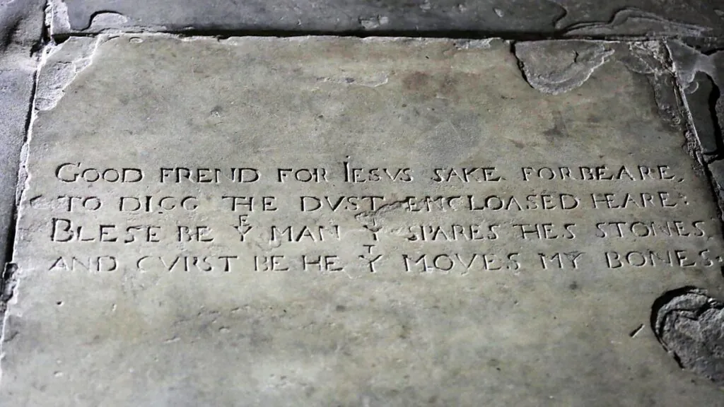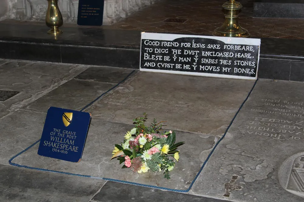 It all sounds well and good, except for the ‘underlying’ fact that Shakespeare had a deathly anxiety — phobia, even — of his bodily exhumation, he was even noted by Professor Philip Schwyzer of Exeter University to have included references to the abuse or exhumation of corpses throughout some 16 of his 37 known plays. As his final literary creation before his death, he wrote a curse which continues to stand above his tomb inside the church of his burial: “Good frend for Jesus sake forebeare,/ To digg the dust encloased heare;/ Bleste be the man that spares thes stones,/ And curst be he that moves my bones.”