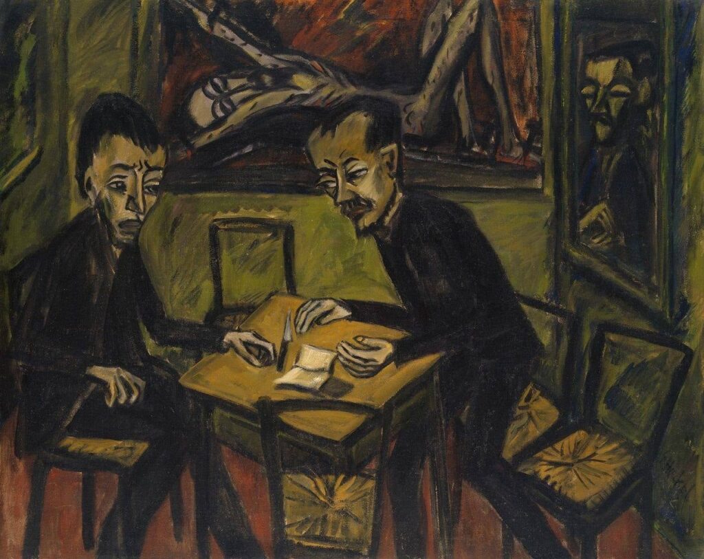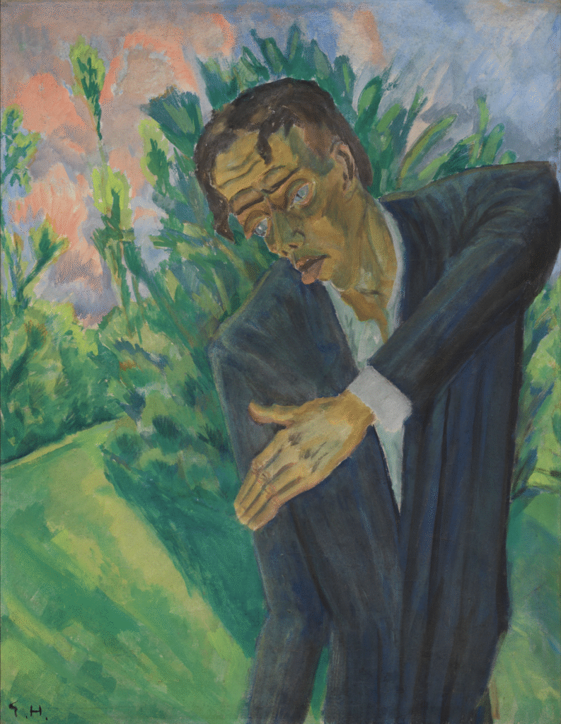 Roquairol stands as one of Heckel’s most psychologically loaded works. The title comes from one of the protagonists of Titan, a novel in four volumes published at the beginning of the 19th century by Jean Paul. Roquairol is depicted as a romantic idealist and aesthete destroyed by his own intensity, a fitting alias for Kirchner at that moment in his life. Heckel painted the portrait not as a flattering likeness, but as a clinical exposure of collapse. The greenish, sickly skin tones, the vacant eyes, and the stiffened pose all suggest a man for whom inner life has become unbearable. In the context of World War I, it also reads as a portrait of a generation spiritually broken by mechanized conflict.
