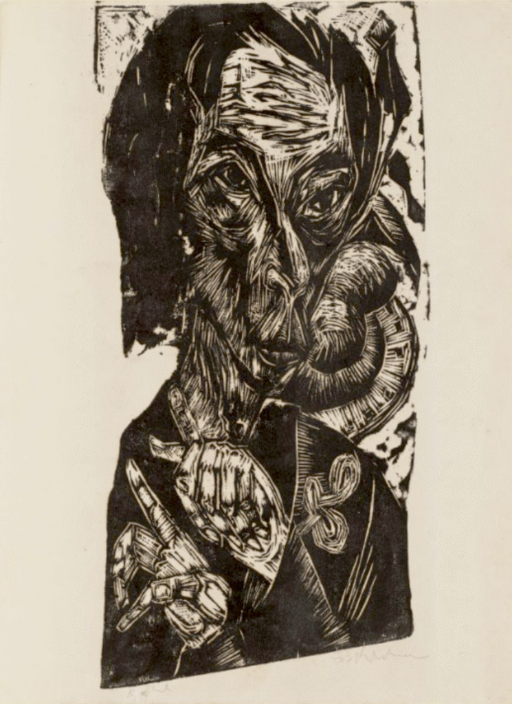 Heckel, in particular, became known for his austere, cutting lines and his ability to render the human figure as something fragile and internally fractured. His woodcuts, often overlooked next to his paintings, were especially brutal and modern, reducing bodies to angular silhouettes and black voids. These prints would later influence not just fine artists but graphic designers, punk zines, and album art in the late 20th century, even if indirectly. In a way, the visual language of post-punk and industrial music owes a debt to Die Brücke’s stripped-down, emotionally violent aesthetic. There is no doubt that David Bowie and Iggy Pop encountered the work of the expressionists and derivative work even before they came to Berlin.