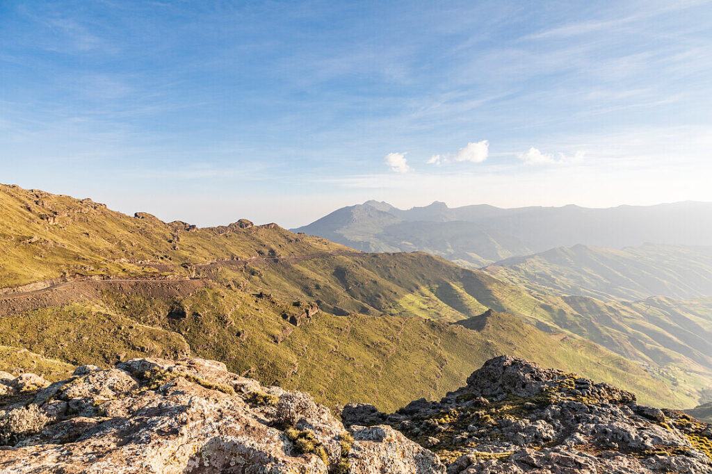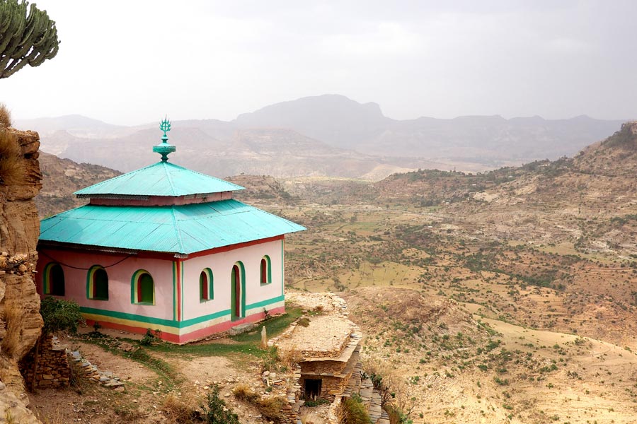 Beyond the central church site the sacred geography extends further into the surrounding highlands. Nearby stands the monastery of Ashetan Maryam, perched high above the town, while the cave church of Yemrehana Krestos, possibly dating to the eleventh century, represents an earlier stage of Ethiopian Christian architecture. Built in the Aksumite style but hidden deep within a cavern, Yemrehana Krestos demonstrates how sacred architecture in Ethiopia often adapted to the natural landscape rather than reshaping it entirely. Elsewhere across the cliffsides are smaller sanctuaries and hermitages, including a tiny church carved into a sheer rock face that can only be reached by a narrow and precarious path. Similar hidden religious sites dot the surrounding mountains, forming a wider sacred network around Lalibela.