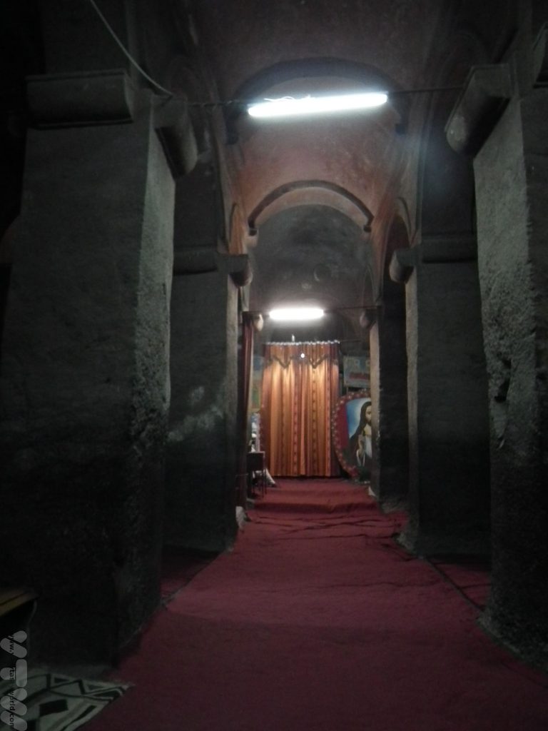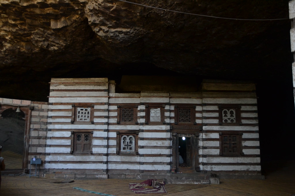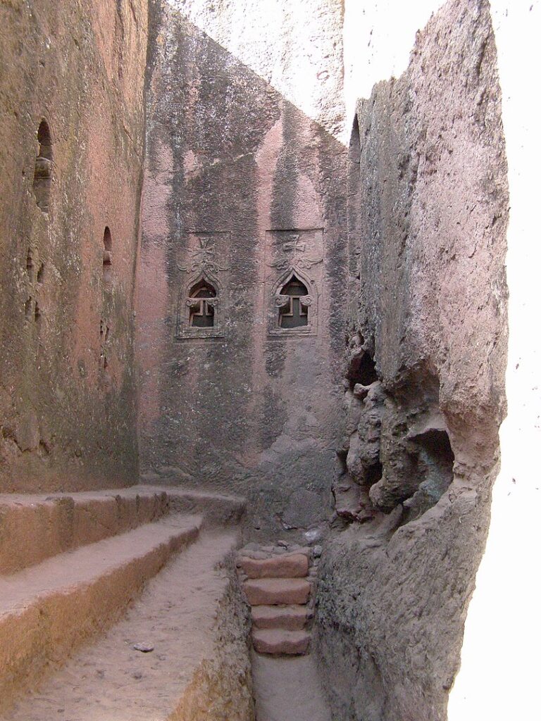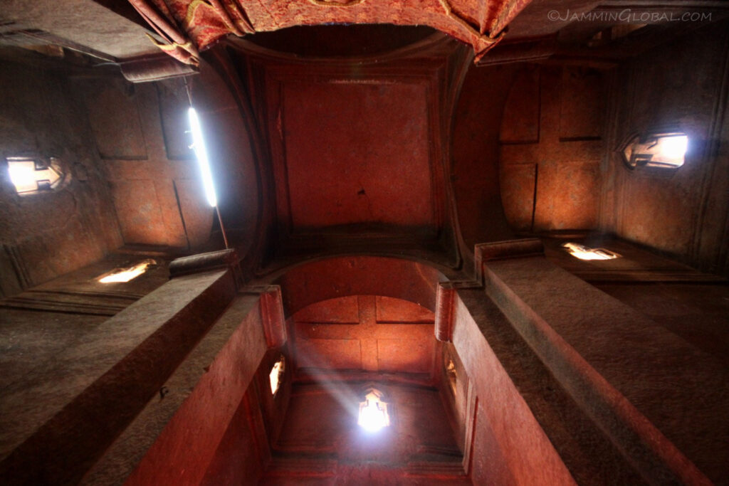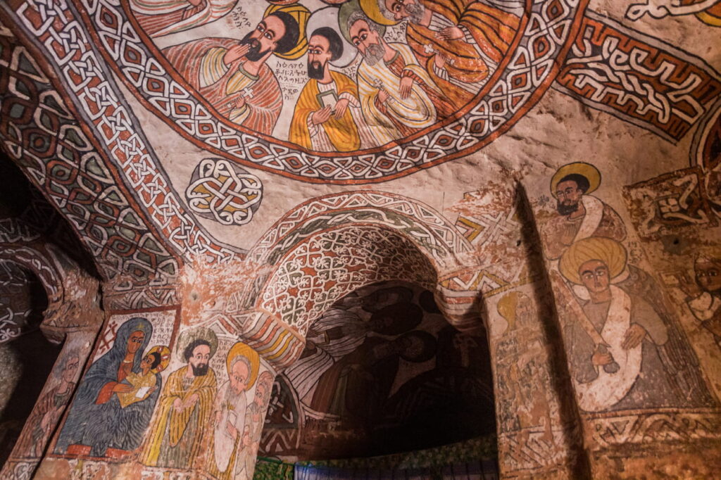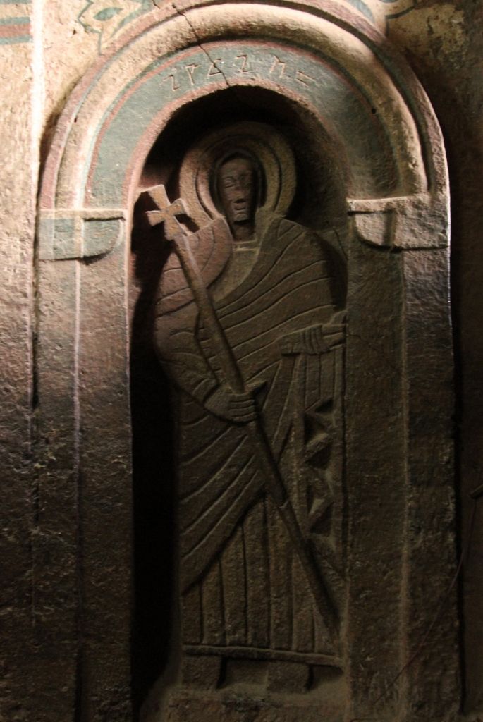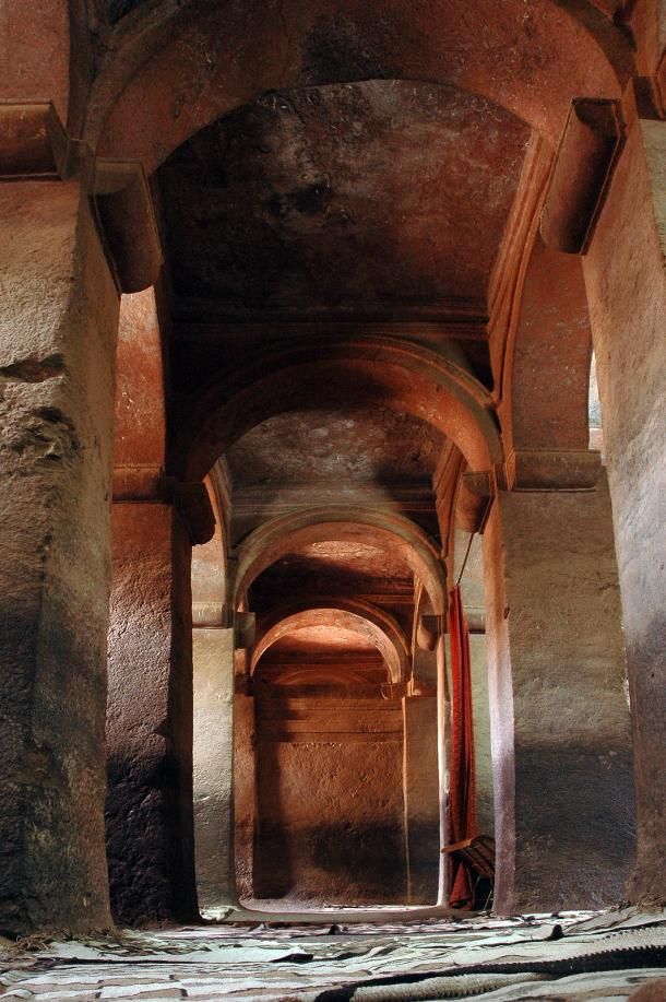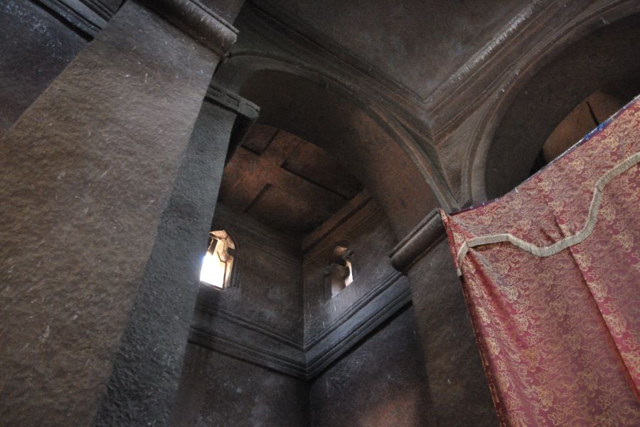 Inside, the decorative program becomes richer. Columns, arches, vaults, capitals, and window frames are all carved from the same continuous rock as the rest of the structure. Painted and carved reliefs, both figurative and abstract, show stylistic connections to Ethiopian manuscript illumination while also incorporating motifs revealing contact with Aksumite art, Greek architectural principles, the Islamic world, and the traditions of Coptic Orthodox Church.