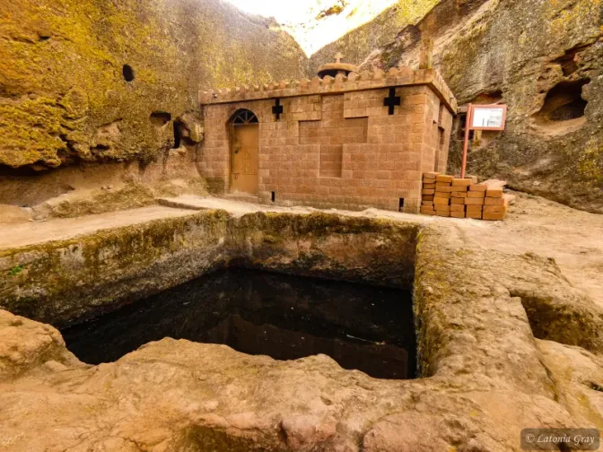 The courtyard surrounding Biete Maryam also contains a feature that blends ancient belief with living religious practice: a small algae-filled pool commonly known as the fertility bath. Fed by rainwater and naturally cleaned during the rainy season, the pool is associated with longstanding traditions of healing. During major religious celebrations, particularly Ethiopian Christmas, women hoping to conceive sometimes travel to Lalibela to be immersed in its waters. Church attendants may lower them carefully into the pool as prayers are recited, reflecting the enduring belief that the site carries a special blessing connected with fertility. Although few can say for certain, the fertility pool is believed to be very deep, roughly as deep as the height of the church itself.