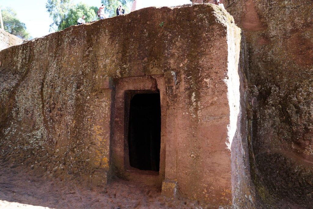 Within the same courtyard are two smaller chapels that contribute to the sacred landscape of the northern cluster. One of these is Biete Meskel, the Church of the Holy Cross. Carved into the northern wall of the courtyard, this modest chapel contains a small prayer hall and a separate chanting chamber used during liturgical ceremonies. Four stone pillars stand within the interior, traditionally interpreted as representing the four Evangelists.