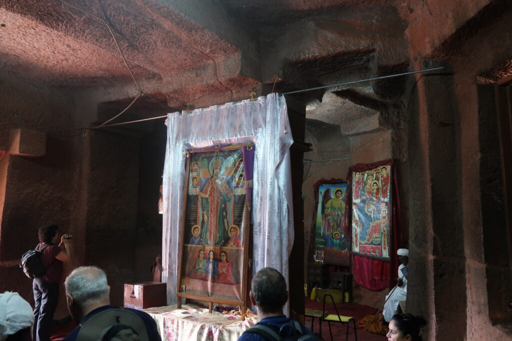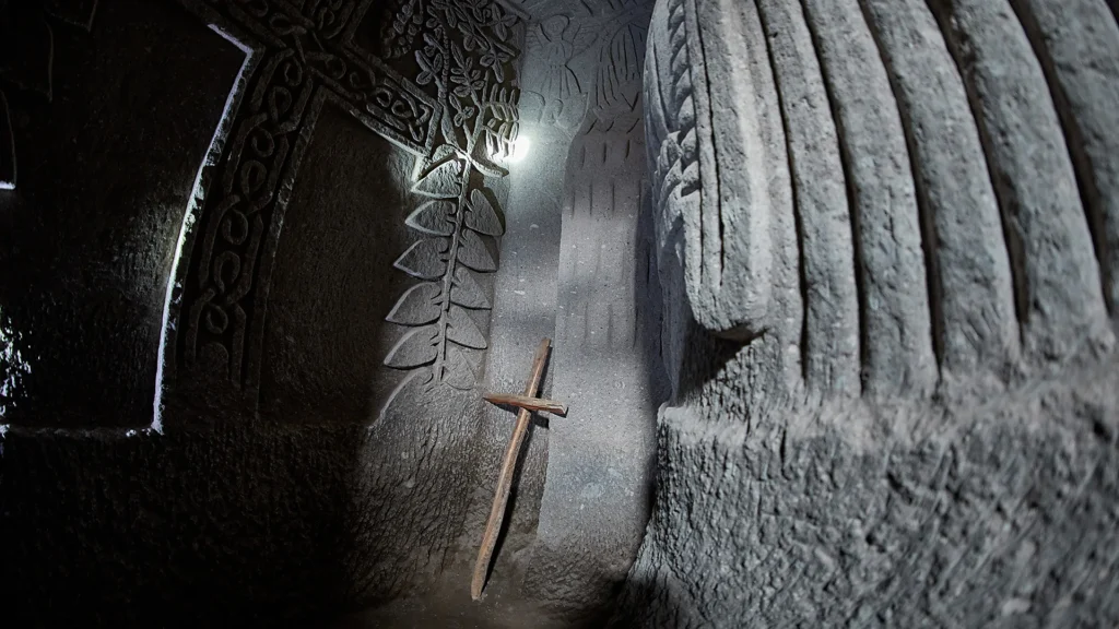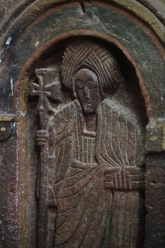 The interior of Biete Golgotha is notable for its ancient Christian artworks. Among its most remarkable features are relief carvings of life-sized saints sculpted directly into the stone walls. These figures, some of the oldest surviving Christian carvings in Ethiopia, create a solemn atmosphere within the dimly lit chamber. Several additional carvings depicting apostles are said to exist behind curtains within the Selassie Chapel, further emphasizing the church’s role as a space of deep spiritual significance.