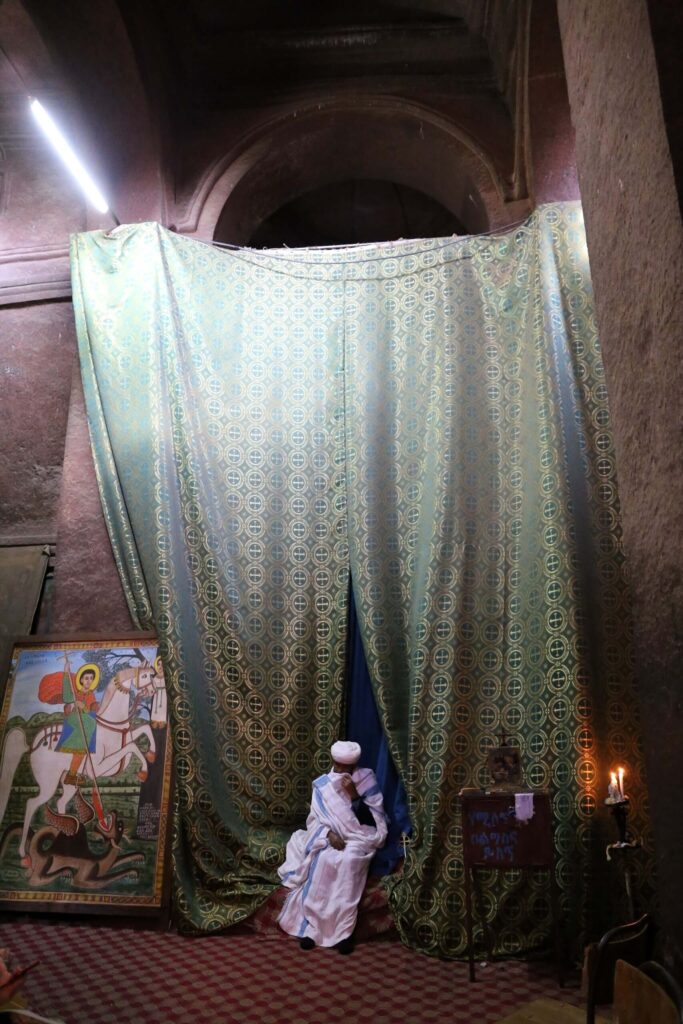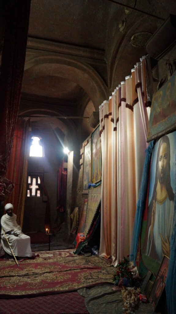 In the same courtyard stands another of the most venerated sanctuaries in the complex, Biete Golgotha Mikael, the House of Golgotha and Michael, carved as a semi-monolithic structure. Technically this structure contains two separate churches, the two share a common entrance before branching into separate sanctuaries. Access to parts of this part of the site by non-ecclesiastical visitors is traditionally restricted by the clergy serving within, with entrance totally forbidden to women. Within its chambers are some of the finest surviving examples of medieval Ethiopian Christian art, including sculpted figures of saints carved directly into stone niches. While some believe these churches were part of the original structures constructed according to King Lalibela’s plans, others suggest they were built much later, late King’s elevation to sainthood by the Ethiopian church in the 15th century.