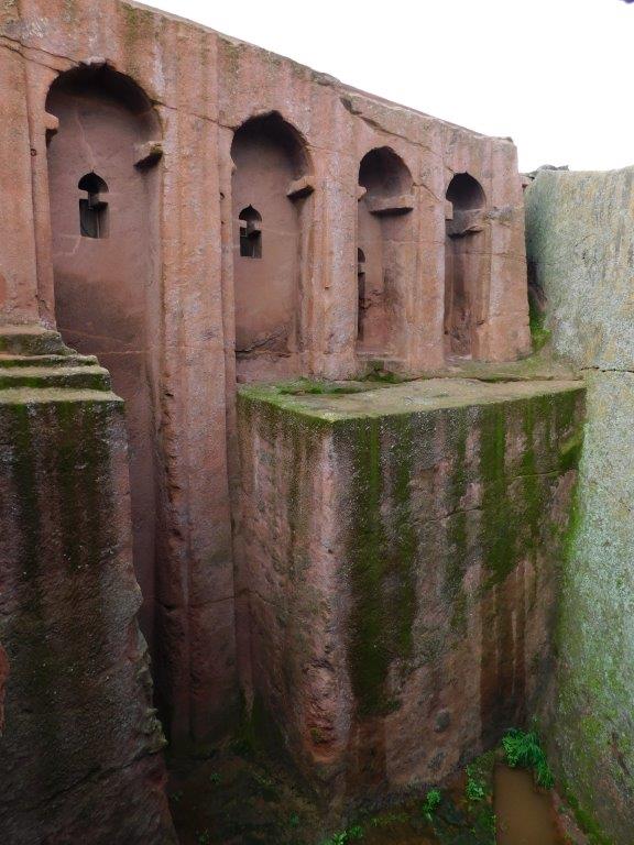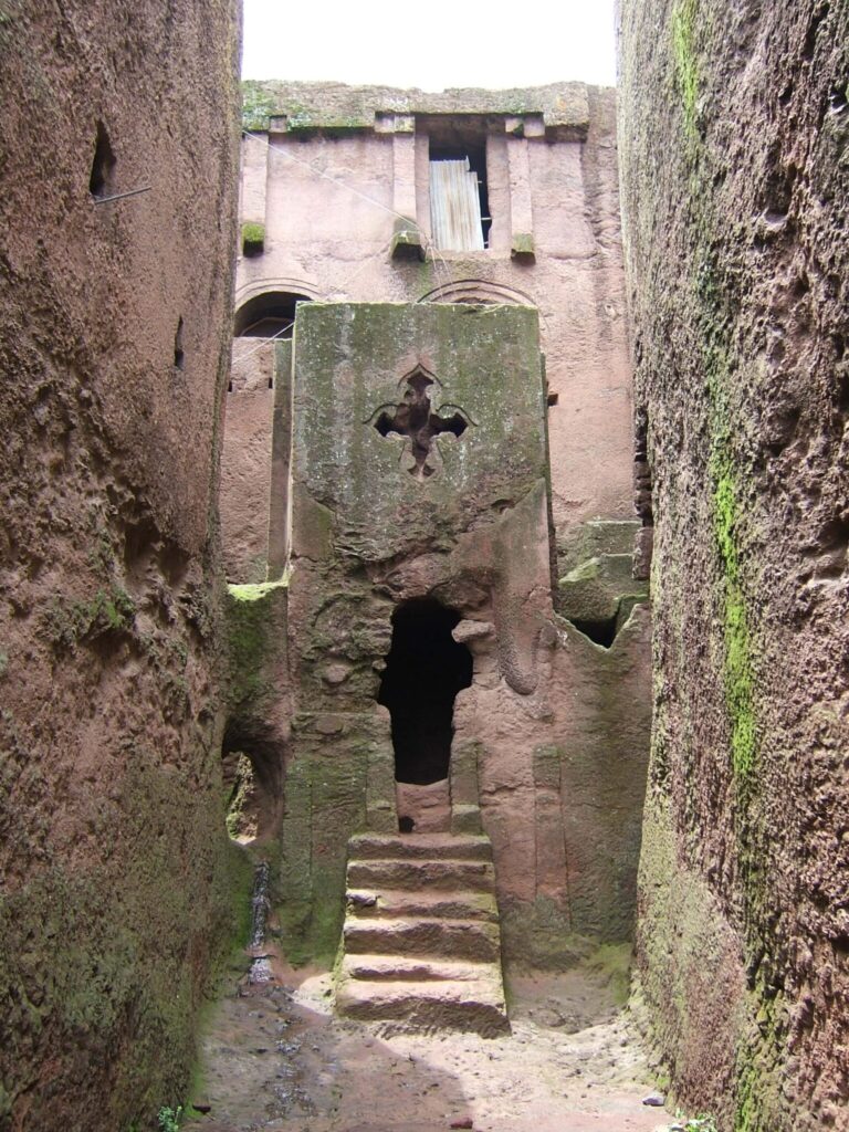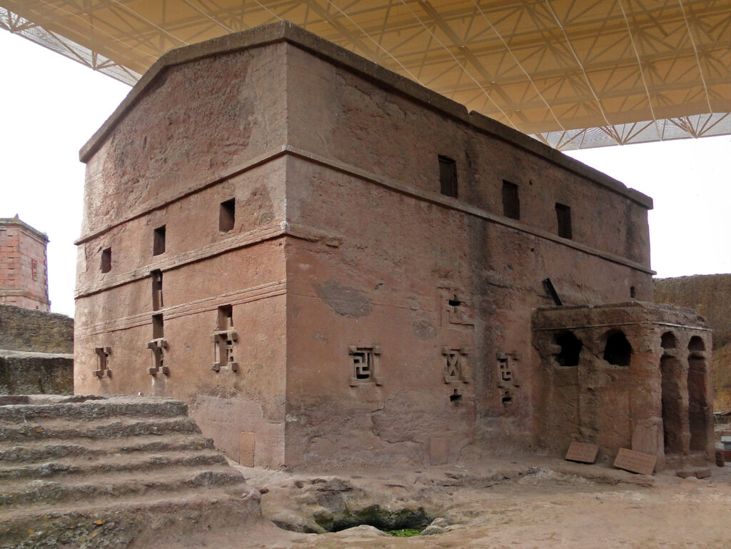 The church rests on a three-tiered plinth and rises approximately fifteen meters from the floor of the pit in which it stands. From ground level above, only the roof is visible; the remainder of the structure lies hidden within the excavated courtyard. The exterior walls display alternating projecting and recessed horizontal bands that recall architectural forms from the earlier Kingdom of Aksum, linking the monument stylistically to Ethiopia’s earlier Christian heritage. The precise symmetry of the cross-shaped plan and the crisp geometry of its facades demonstrate the remarkable engineering skill achieved by the medieval builders.
