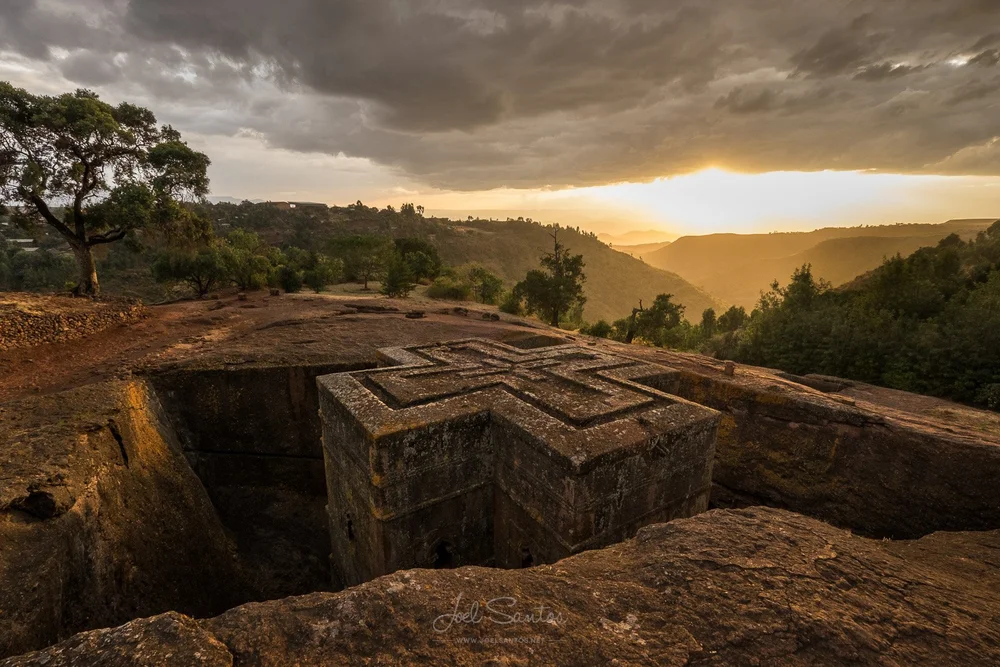 Among the monolithic churches carved into the volcanic landscape of Lalibela, none is more recognizable than Biete Giyorgis, or The House of Saint George. Considered the final church constructed in the Lalibela complex and the most finely executed and best preserved of Lalibela’s churches, its isolated placement and near-perfect symmetry have made it the most recognizable structure in the entire complex. Carved in the form of an equilateral Greek cross, the church sits within a deep courtyard enclosed by sheer rock walls. Visitors reach the structure by descending through a narrow rock-cut tunnel and trench system that gradually reveals the building below ground level.