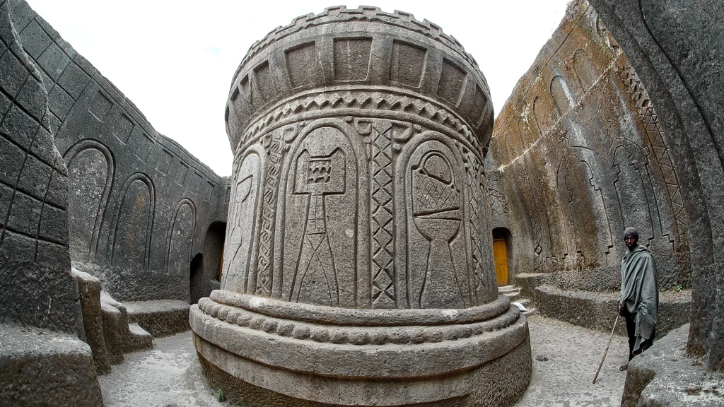 Scholars have identified clear influences from the architecture of the Kingdom of Aksum, which flourished more than eight centuries earlier. Among the most sophisticated structures are large basilicas with three or even five aisles, complete with carved columns, window openings, and intricate geometric ornamentation. These details, cut directly into the stone both inside and out, demonstrate not only technical mastery but also the continuation of architectural ideas that had shaped Ethiopian Christianity since the early medieval period.