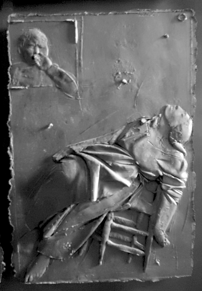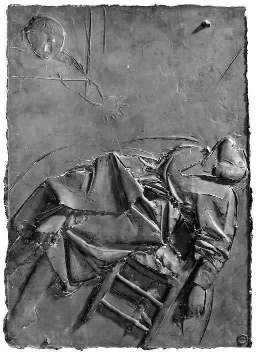 Perhaps the most emotionally devastating panel is Death on Earth, positioned at the lower right and serving as the final statement in this sequence on mortality. Here, a nameless, worn woman collapses against a tipping chair, while a child looks on in terror, crying as he witnesses his mother’s last moments. The restrained, tender modeling of the figures transforms the act of dying into something both intimate and inexorable, with the immanent pull of gravity as a result of the chair falling over conveying the immediacy of the loss.