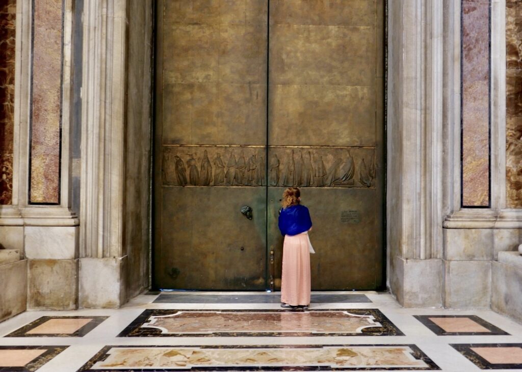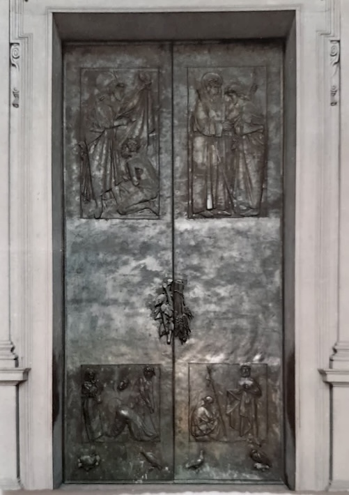 Measuring 20 feet in height, the door is composed of ten bronze reliefs arranged in five rows, framed by a vertical motif of vine and wheat, the Eucharistic symbols of wine and bread. At the top are the Death of Christ and the Death of Mary, rendered in elongated, almost weightless forms that remain legible even from the steps of the basilica.