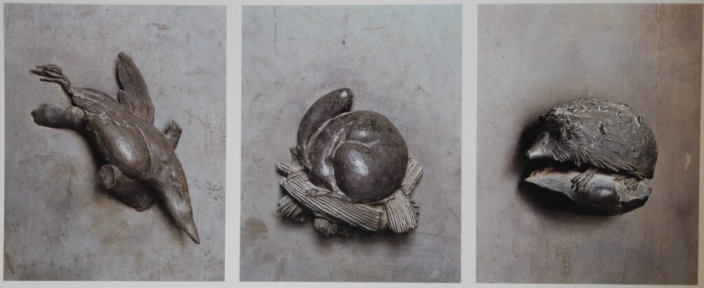 At the base of the door, almost invisible to the hurried visitor, six animals are modeled in low relief: a blackbird, a dormouse, a hedgehog, an owl, a tortoise, and a raven. Drawn from medieval symbolic tradition, they evoke sleep, time, vigilance, decay, and foreknowledge, quietly reinforcing the theme of mortality.