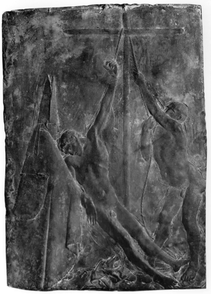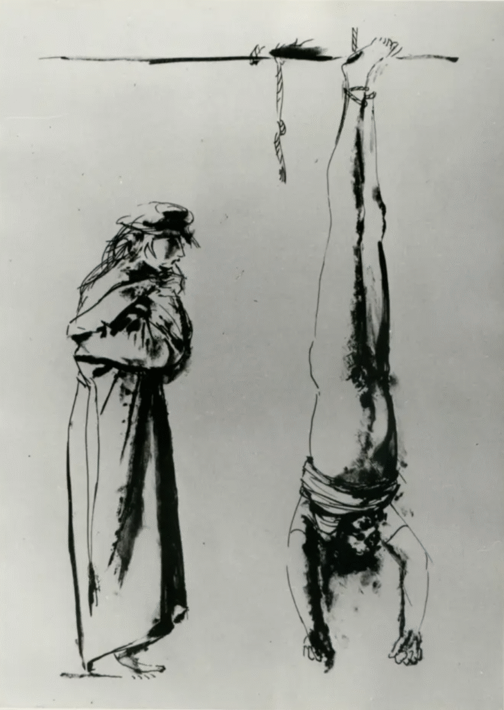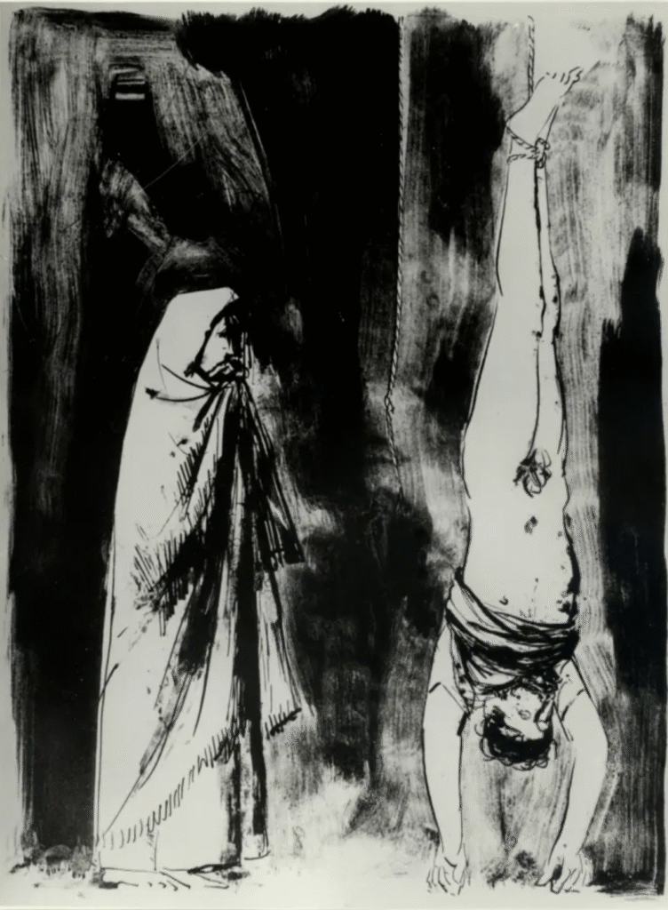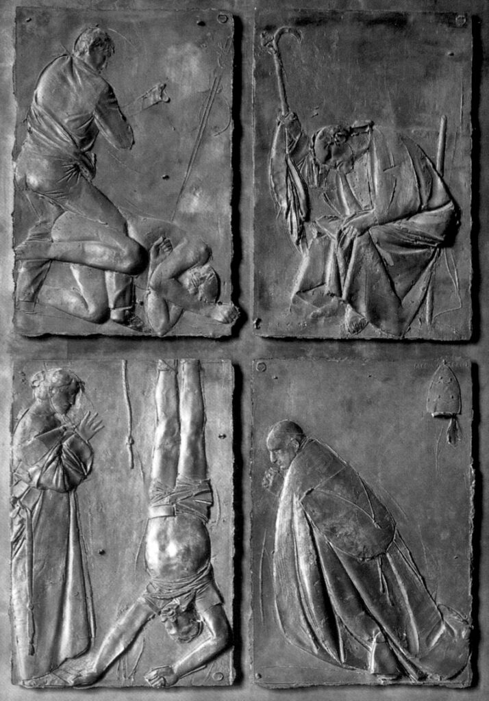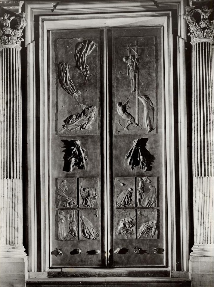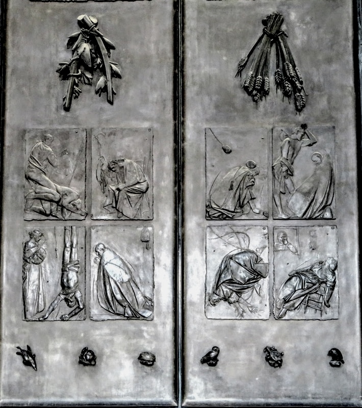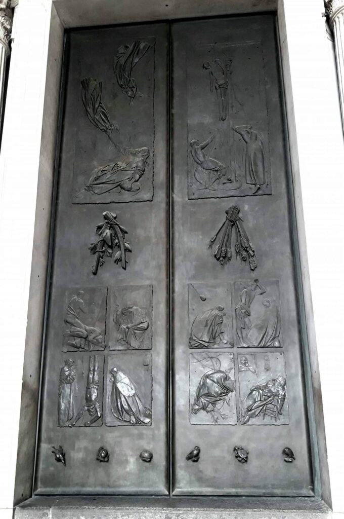 However, most controversial was the lower section of the outside, which depicts scenes not strictly related to Christianity but rather the horrors of history and nature: death by violence, death in the air, death on earth, as well as the death of Pope John XXIII as a tribute to the pontiff who had supported the door’s creation and who was unable to live to see his work completed. One panel in particular drew especially strong criticism, in which a cardinal gazes at a man hanging upside down, allegedly referencing the hanging executions of Italian fascists after the Second World War.