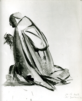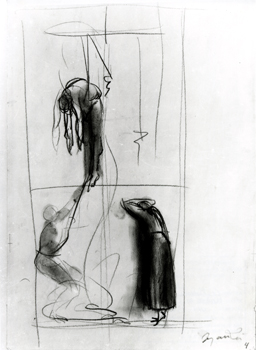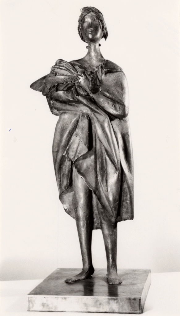 Born in Bergamo in 1908, the son of a poor shoemaker, Manzù was largely self-taught. At age of 11, he took on a job assisting a local carpenter, going on to work on plaster decorations. It is said his first works of art were figures he modeled from leftover candle wax in the church where his father worked as a sacristan. His early fame came from austere sculptures of cardinals and emotionally restrained religious reliefs, but his work consistently mixed elements of the sacred, the erotic, and the political. Over a career of almost seventy years he produced busts of celebrities, female nudes, and monuments for institutions ranging from the United Nations to the Rockefeller Center, and even stage designs for Igor Stravinsky’s opera Oedipus Rex, created at the composer’s request.