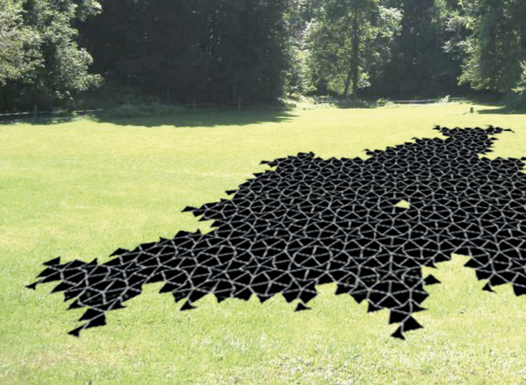 At the largest scale, Wilson proposed a monumental landscape intervention called Black Sun Rose, intended as a possible marker for the WIPP. The design envisioned a pyramidal megastructure built from thousands of interlocking blocks arranged according to Penrose tiling patterns, creating a repeating geometric structure that clearly signals deliberate human design. Cast from black concrete, the structure would absorb solar radiation, making the environment hostile to plants, animals, and human habitation. Covering an area roughly four miles across, large enough to encompass the buried WIPP site, the Black Sun Rose would appear as a stark artificial scar on the desert landscape, visible even from space.