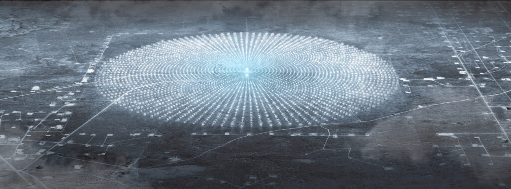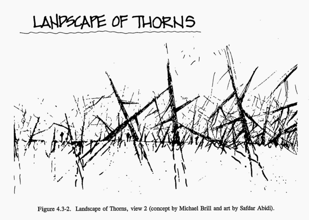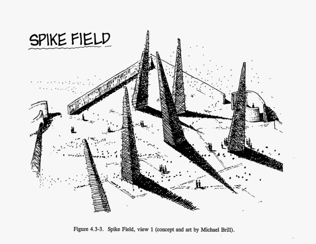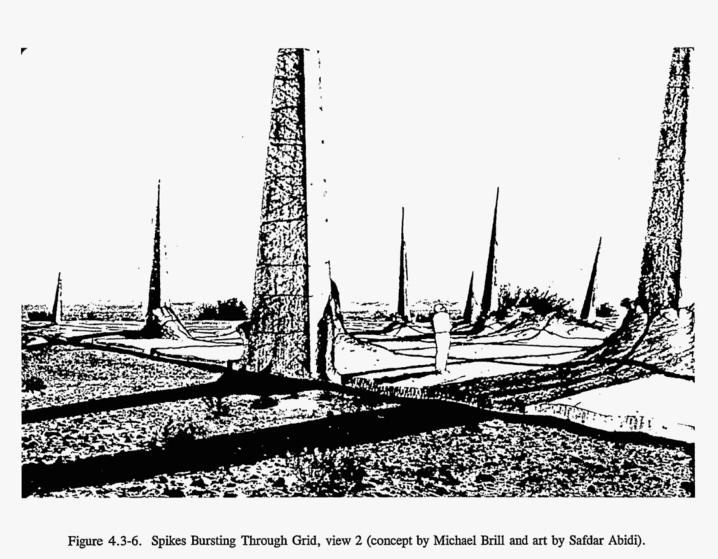 Other competition entries pursued a different strategy: making the landscape itself hostile or unsettling. Designers Goil Amornvivat and Tom Morbitzer proposed a project called Fields of Asphodel, a vast metal meadow composed of thin steel blades that would emit an eerie, screeching sound as wind passed through them, turning the desert into an unsettling acoustic warning.