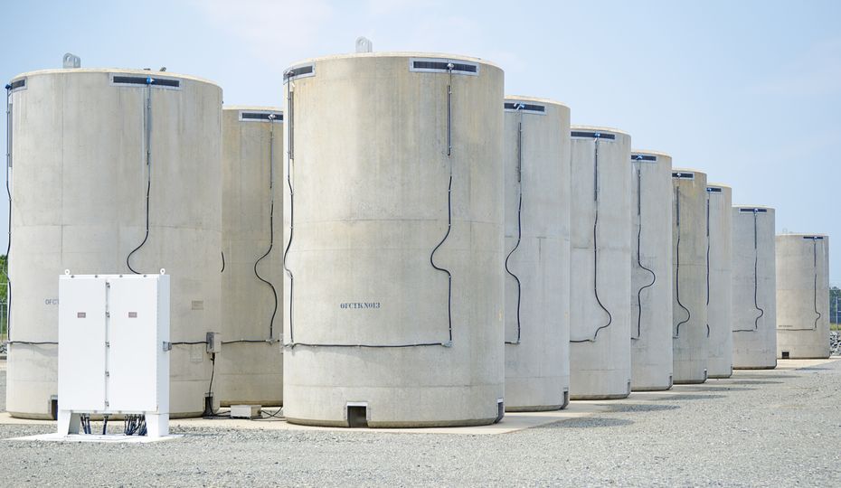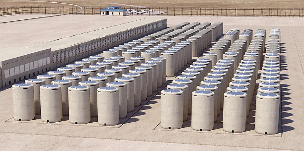 Meanwhile, storage problems continued to grow. Most nuclear plants were never designed to hold decades of waste, and their spent-fuel pools must retain empty capacity in case of emergencies such as a reactor meltdown. Without a permanent repository, utilities increasingly rely on dry cask storage. In this system, used fuel rods are sealed in steel containers filled with helium or another inert gas, then encased in massive concrete cylinders weighing more than 100 tons. Each cask costs roughly $1 million, still emits about one millirem of radiation per hour, and warms the surrounding concrete casing to roughly 90°F (32°C).
