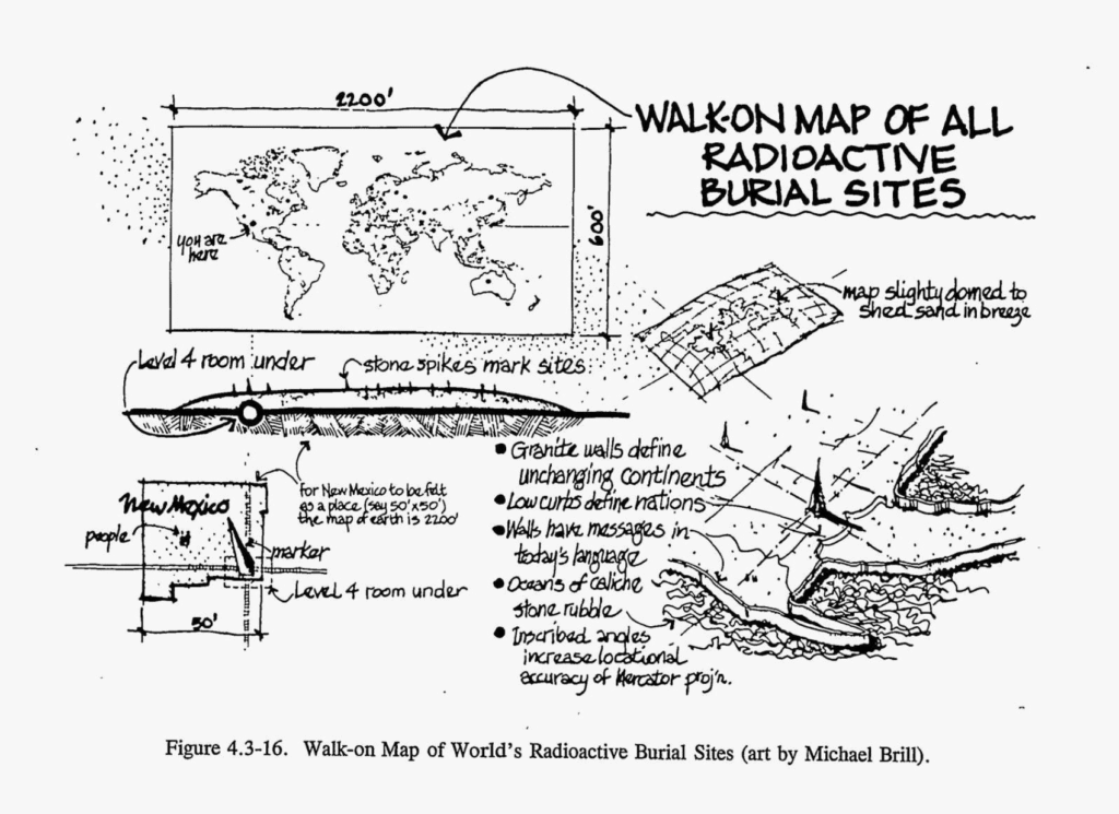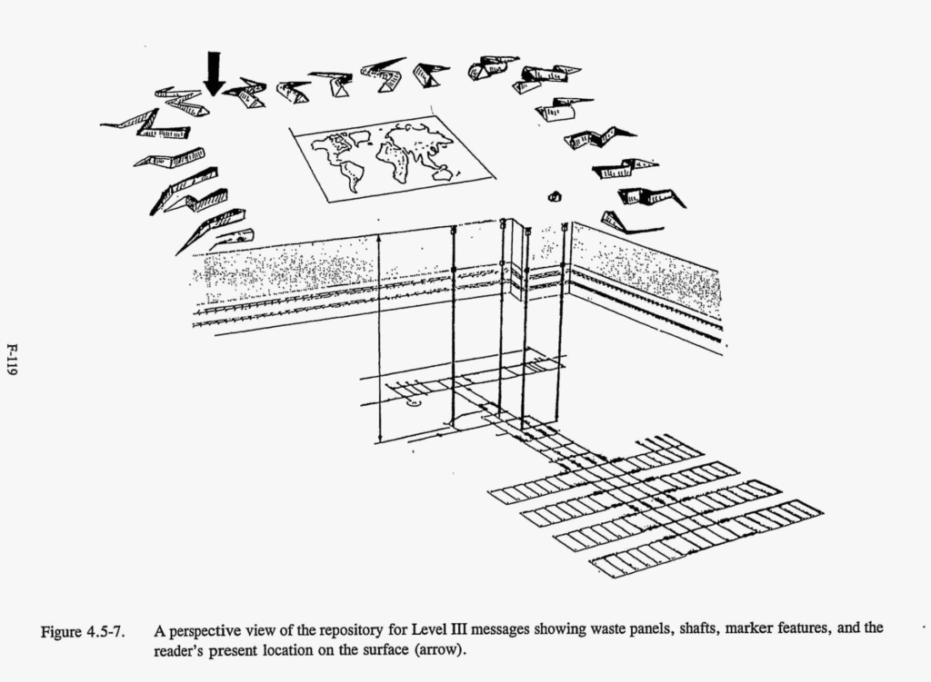 Several members of the task force suggested further long-term information strategies alongside the physical warnings. One proposal involved distributing detailed records about the repository to libraries and archives around the world. By dispersing the information globally, the designers hoped to retain global knowledge of the site’s danger in the face of a catastrophic loss of knowledge similar to the destruction of the Library of Alexandria.