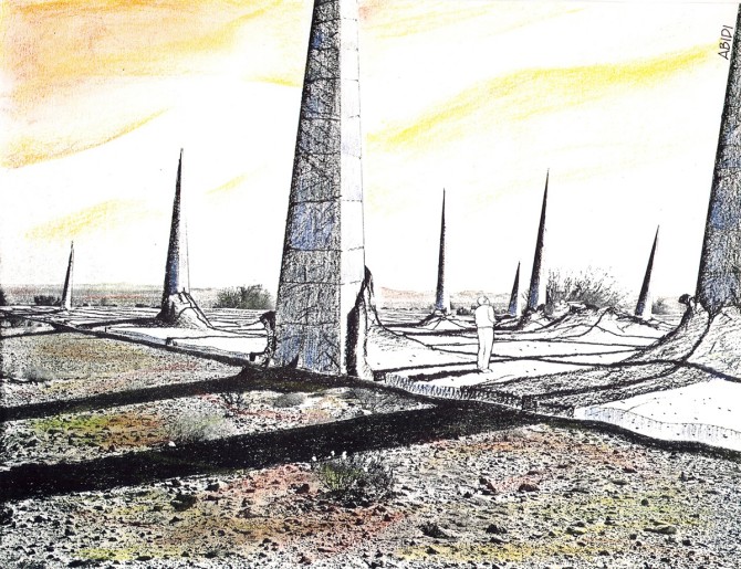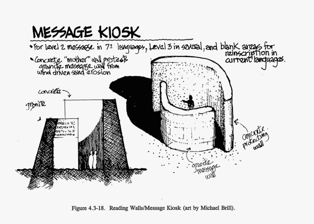 Working with the task force in 1981, Hungarian folklorist Vilmos Voigt from Eötvös-Loránd University in Budapest proposed installing warning signs written in the world’s major languages arranged in concentric rings around the repository. Roughly every few generations, the messages could be rewritten in contemporary languages so they would remain understandable, while the older inscriptions would remain in place as a historical chain of interpretation.