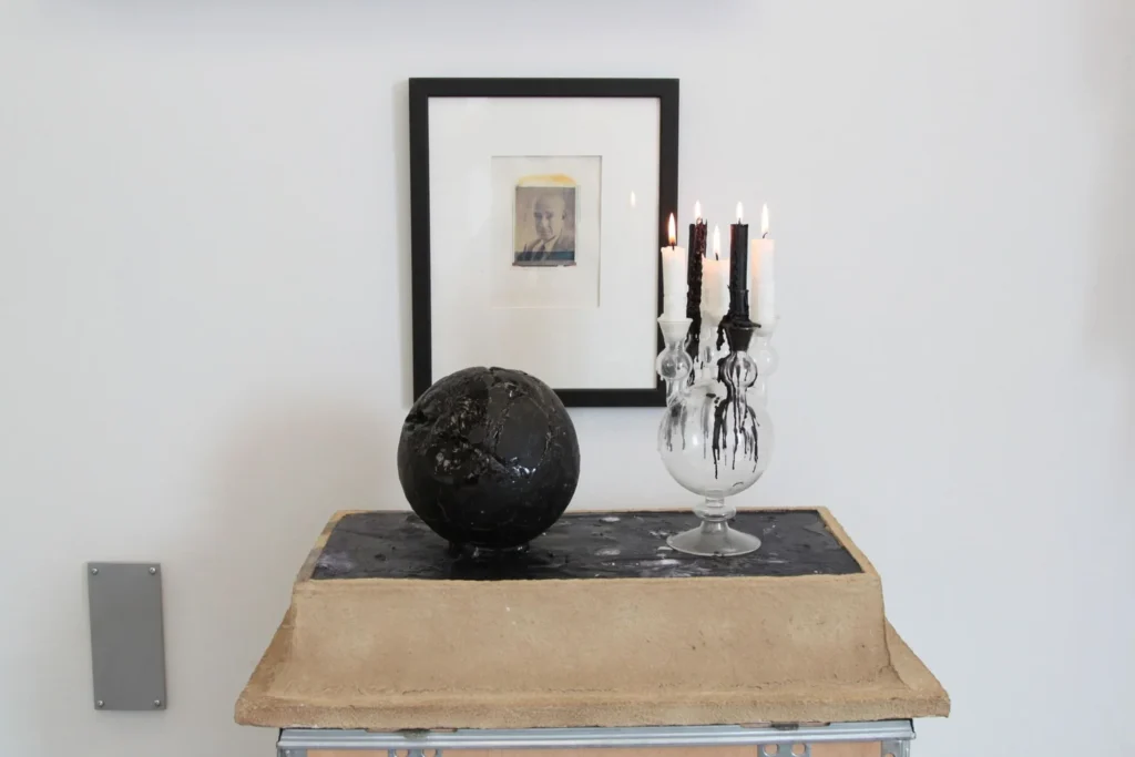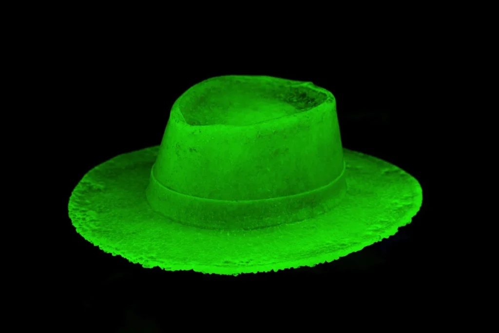 The project also proposed the “vestments” incorporate bio-sensing materials and silver-lined fabrics designed to resist microbial contamination and environmental toxins, blending contemporary wearable technology with ceremonial symbolism. The resulting “Atomic Priest” figure was photographed at archaeological sites across the region as a way of testing how ritual, symbolism, and landscape might combine to produce long-lasting cultural memory. The project expanded these ideas through a series of artworks and speculative proposals. These included “pilgrimages”, “ritual inscriptions” in the form of tattoos, altars dedicated to “St. Oppenheimer,” and symbolic objects such as a model of Oppenheimer’s hat cast in uranium glass.