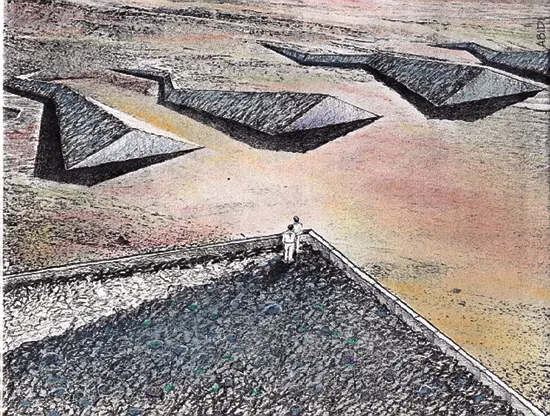 ANDRA has continued these efforts through competitions, including one offering a €6,000 prize for proposals aimed at preserving the memory of the Cigéo repository far into the future. In one of the agency’s recent competitions, the first prize went to Alexis Pandellé for Prométhée oublié (“Forgotten Prometheus”), a proposal that imagines the site marked by a scar carved into the landscape, a vast land-art gesture suggesting a wound that will never fully heal.