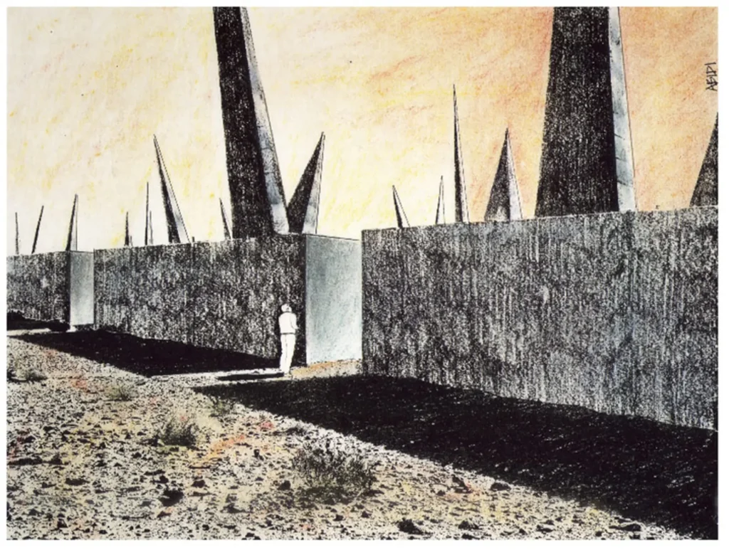Other entries relied on time itself as the warning. One design proposed dividing the 16-square-mile site into thousands of colored geological “subpixels,” creating a vast geochromatic landscape that would slowly transform over centuries. Another envisioned columns designed to attract lightning strikes, gradually weakening and collapsing after 10,000 years. One design proposed a giant labyrinth whose walls grow progressively higher the deeper one travels into it, discouraging entry. Another suggested arranging 10,000 standing stones in an Archimedean spiral, with one stone removed each year, creating a visible countdown that would last for ten millennia.