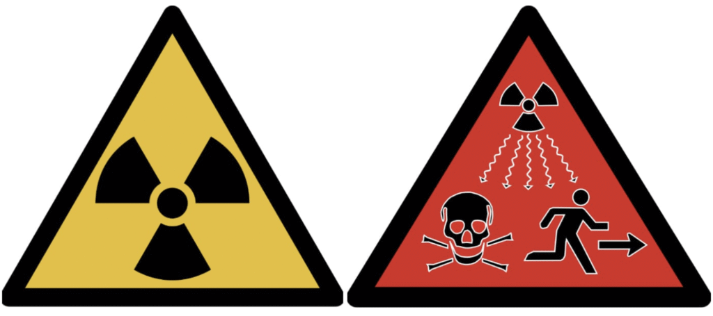 The response was to introduce yet another new supplementary sign: a red warning symbol combining the trefoil with radiating waves, a skull and crossbones, and a running figure fleeing the scene. The design was meant to convey a universal message: danger, radiation, get away, even to those who had never encountered the trefoil before. Importantly, this new symbol was not meant to replace the original. Instead it serves a different purpose: a stark “Do Not Touch” warning for sealed radiation sources that should never be handled directly. The traditional trefoil still appears in many other contexts, such as transport containers and regulated facilities.