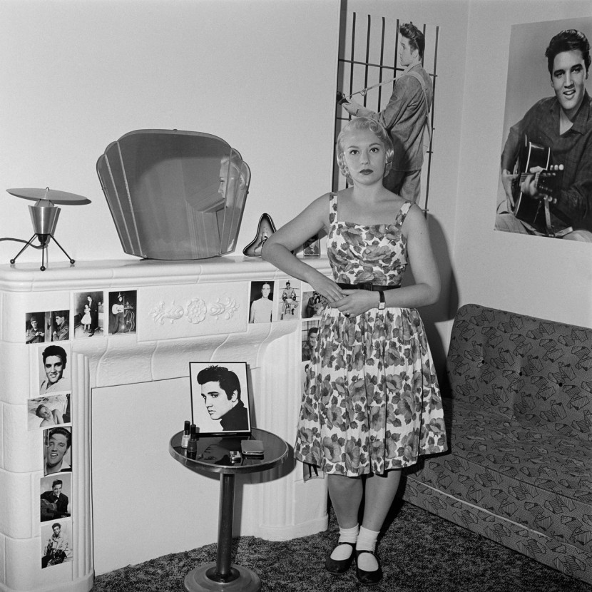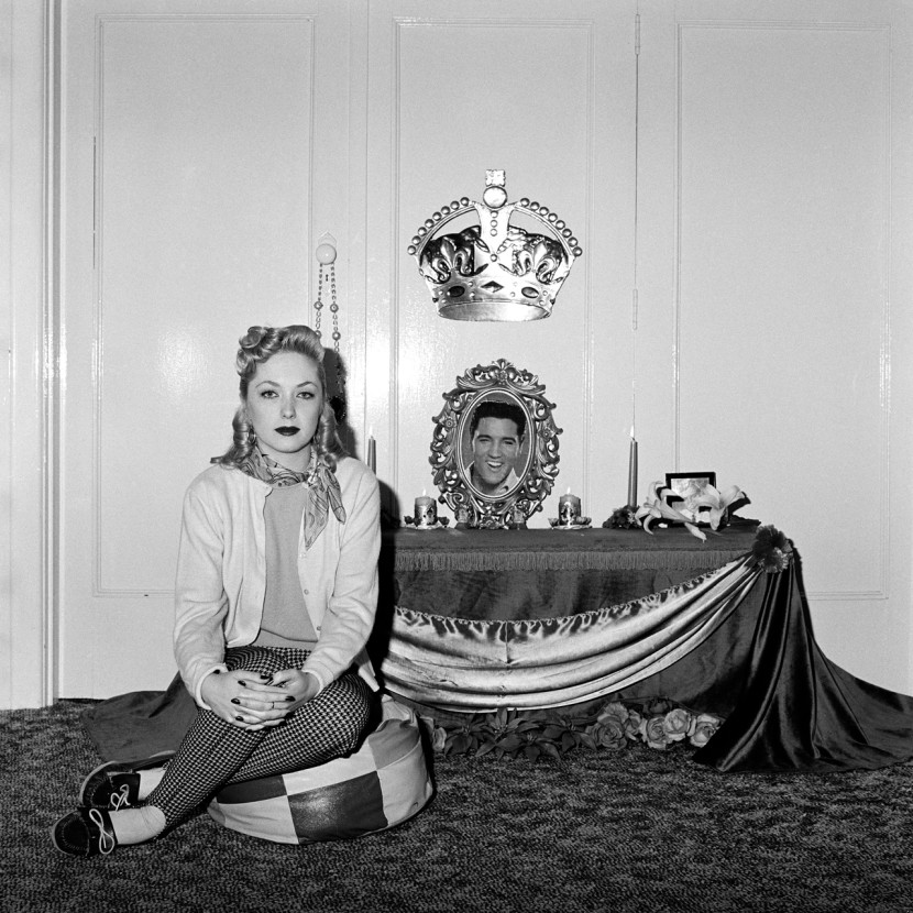 Beyond the public rituals, she documented domestic Gracelands assembled in suburban living rooms, carefully preserved vinyl collections, scrapbooks, and relics treated with near-religious care. She photographed intimate performances enacted for no audience beyond the camera itself. These interiors, mundane but reverential, reveal how fandom infiltrates daily life, becoming less an escape than a structuring presence.