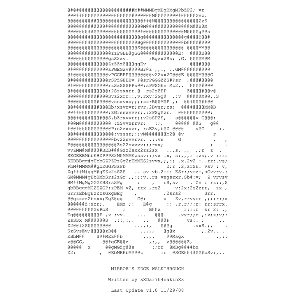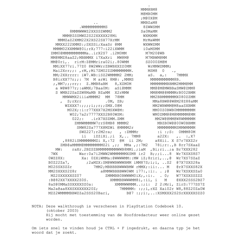 Stripped of images, formatting, and sometimes even punctuation, these walkthroughs were built to load instantly on dial-up and to survive being printed on cheap home inkjets. Within those limits, ASCII art emerged as a quiet flex, usually in the form of an elaborate portrait of the main character or the game’s logo rendered in letters, numbers, and symbols right at the top of the guide.