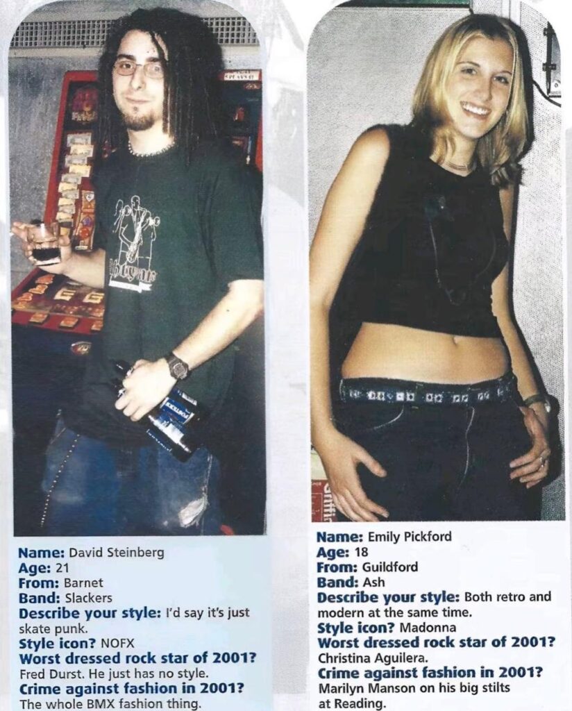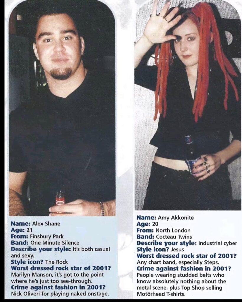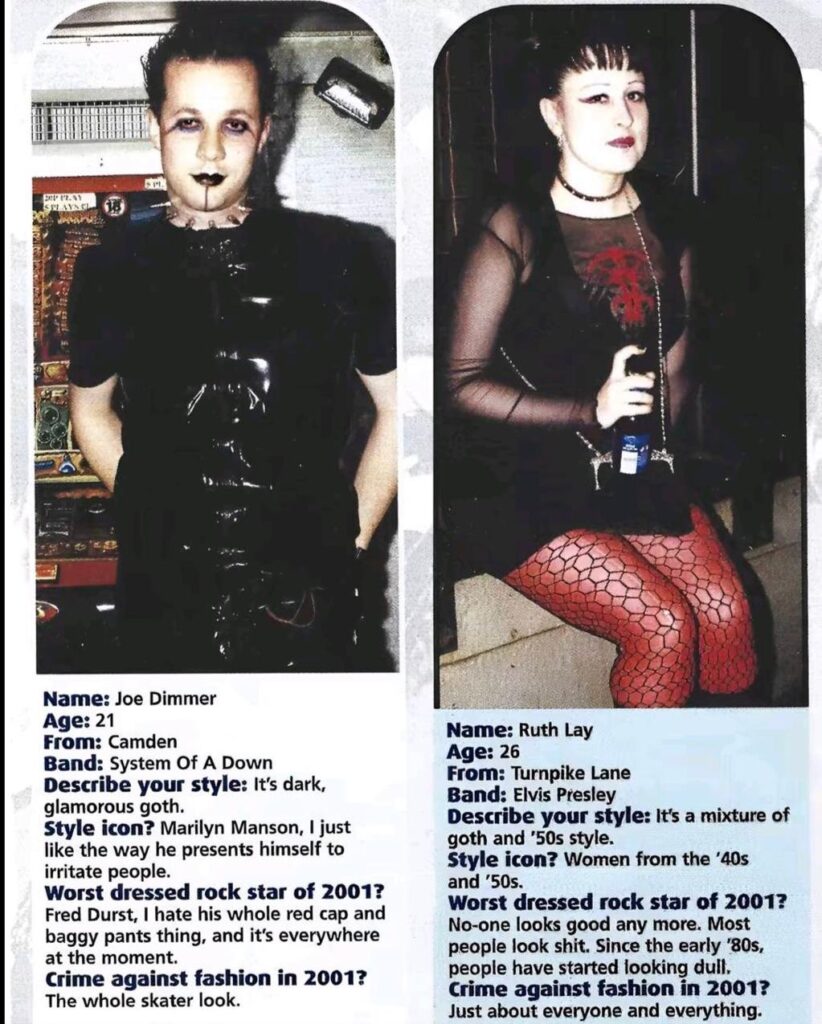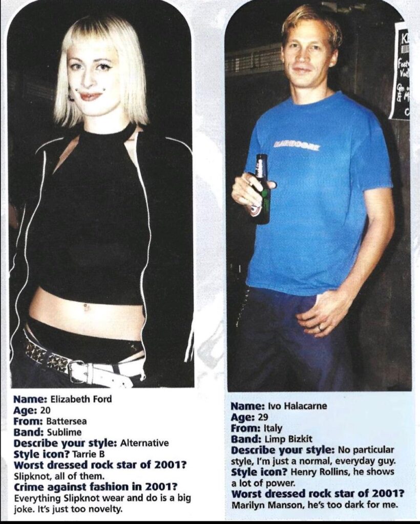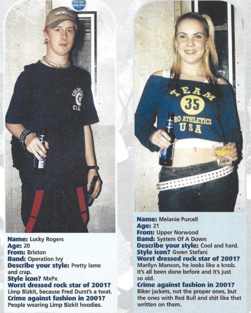 Styles and thoughts from rock music fans in and around London, from Kerrang magazine’s 2001 yearbook section. Very strong opinions about Marilyn Manson and Fred Durst in particular.