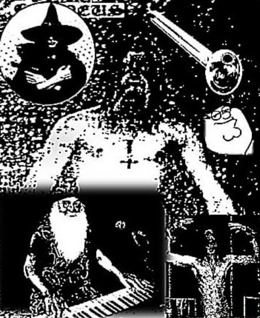 One of the most recognizable recurring motifs is what is called the “Prancing Wizard.” These figures are usually adapted from historical woodcut illustrations and edited to appear as if they are dancing, raving, or striking exaggerated poses. A particularly common gesture is the “nose thumb,” a traditional sign of mockery in which the thumb is placed against the nose while the fingers wiggle outward. The gesture has deep roots in European folk humor and appears in stories about trickster figures such as Till Eulenspiegel, a mischievous character from German folklore known for humiliating authority figures through pranks. In Keller Synth artwork, the gesture signals the genre’s playful, irreverent attitude toward its own influences.