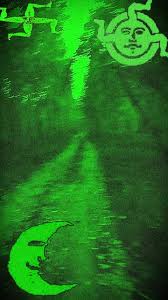 Another recurring symbol is the triskelion, a three-legged spiral motif sometimes depicted as a stylized sun face, traditionally found in ancient Welsh and Sicilian cultures. In Keller Synth imagery it often appears in bright lime green, reinforcing the genre’s distinctive color palette.