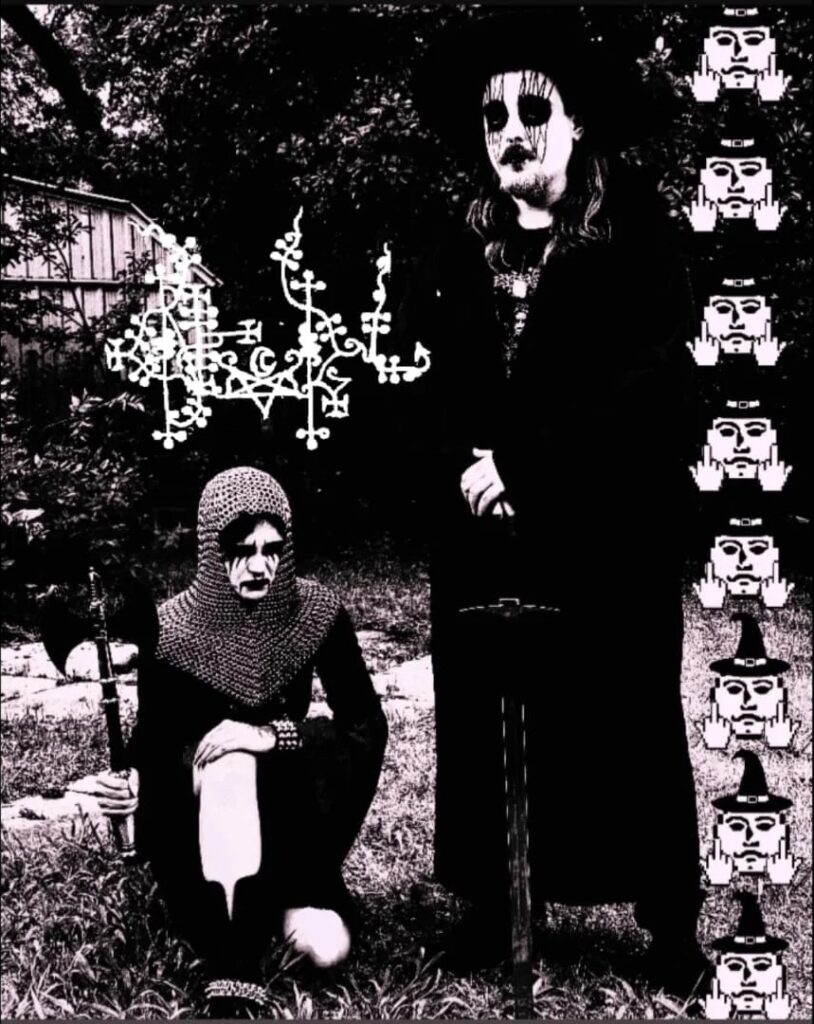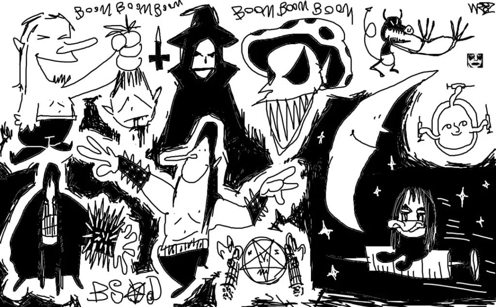 Typography and graphic design play an unusually important role in defining the genre’s identity and helping it spread across the internet. Keller Synth artwork deliberately exaggerates and parodies the visual language of traditional black metal. Band logos are often intentionally crude, appearing as though they were drawn in MS Paint or sketched hastily with jagged lines. Extreme illegibility is treated as a stylistic virtue. Letters frequently dissolve into chaotic tangles of linework in which symbols as varied as inverted crosses, triskelions, swastikas, crescent moons, and wizard hats, blend directly into the lettering. Black metal and dungeon synth had already embraced illegible logos as a marker of underground authenticity, but Keller Synth pushes the approach into a more humorous and whimsical direction as a kind of blackened whimsigoth.